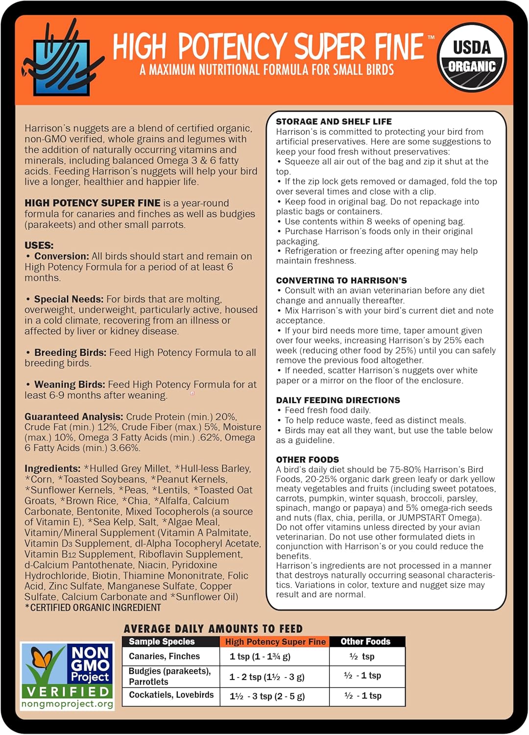 - FOR SMALL BIRDS: Harrison's Bird Foods HIGH POTENCY SUPER FINE, a certified organic, non-GMO formula crafted by avian veterinarians and avian nutritionists for canaries, finches, budgies, parrotlets, cockatiels, lovebirds, and other small birds. It ensures essential nutrition in a nutrient-dense formula for converting to our formula, under 1 year of age, breeding, weaning chicks, recovering from an illness, or molting.