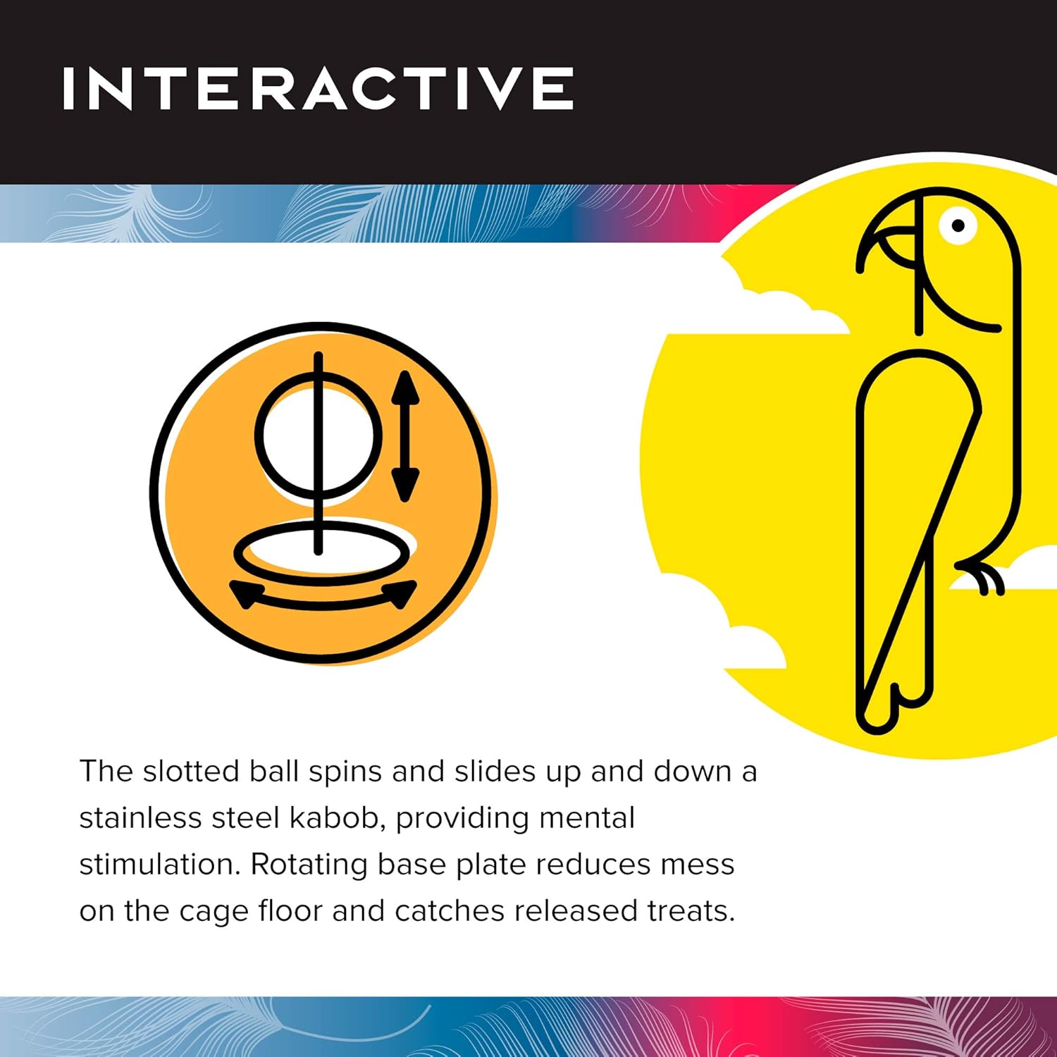- FUNCTION: The slotted ball spins and slides up and down a stainless steel kabob, providing mental stimulation; Rotating base plate reduces mess on the cage floor and catches released bird treats