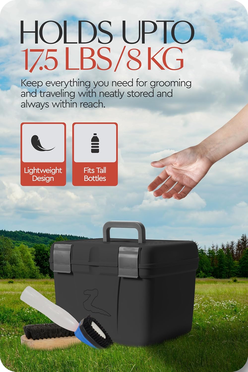 - More Than Just a Grooming Box: This grooming tote box doubles as a step for when you need one. Thanks to a non-slip surface on the lid you can safely use the box as a step to help groom your horse.