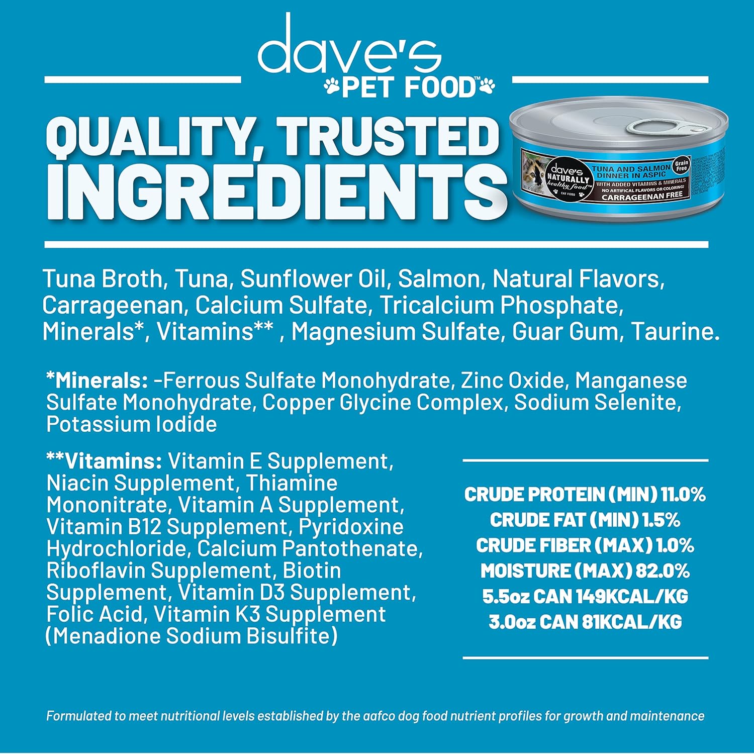 Dave's Pet Food Grain Free Wet Cat Food (Tuna & Salmon Dinner in Aspic), Naturally Healthy Canned, Added Vitamins & Minerals, 5.5 oz Cans (24 Pack