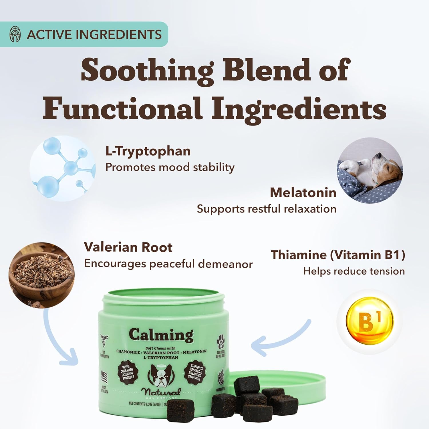 Natural Dog Company Calming Chews for Dogs, Stress & Anxiety Relief Supplement with Chamomile, Valerian Root & Melatonin, Natural Soothing Chews for Travel, Thunder, Fireworks & Separation (90 cnt)