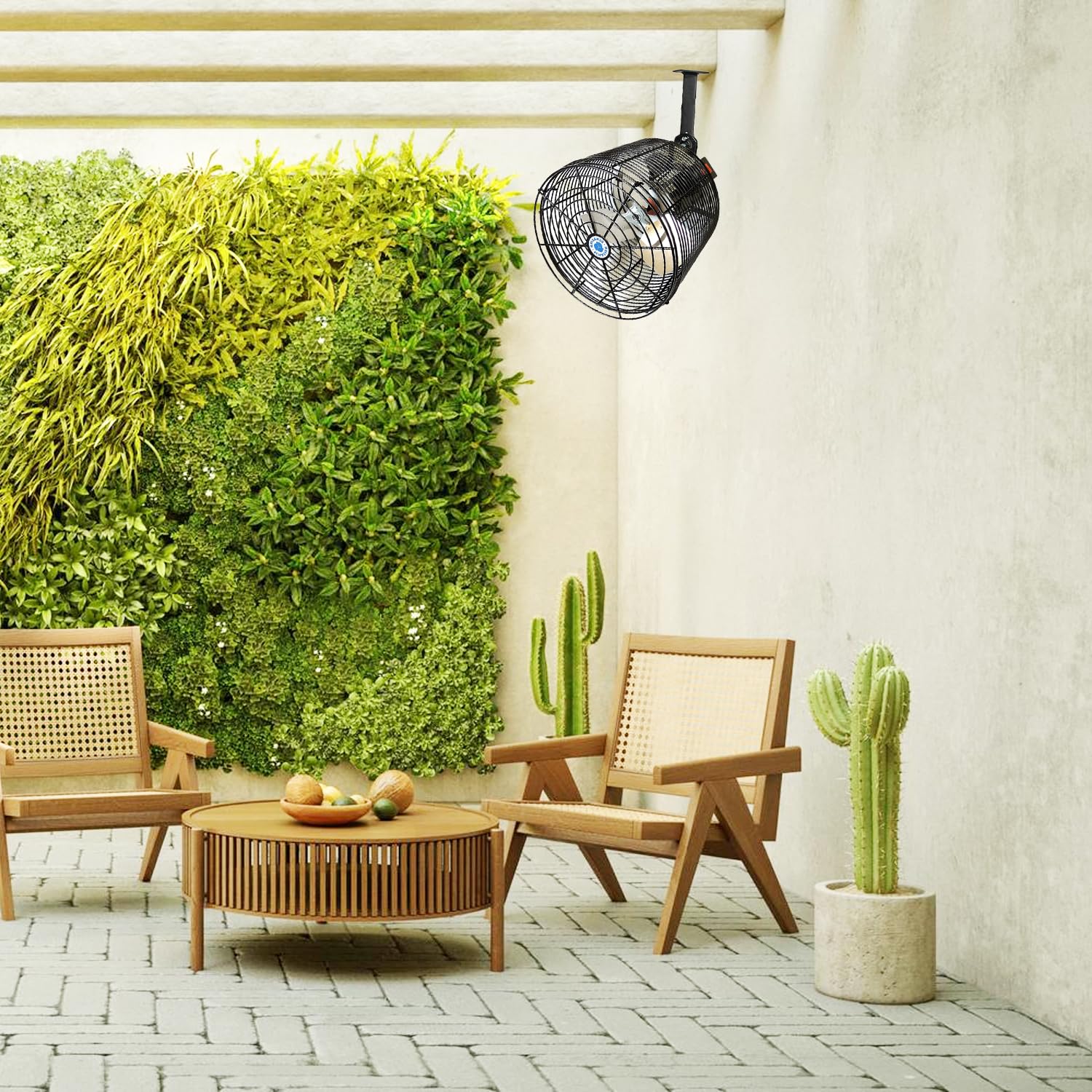 - QUIETER COOL: Experience effective temperature control with the deep-guard design of this wall-mounted fan, minimizing noise without compromising on safety. It's the outdoor fans' solution for events, blending performance and tranquility. FAN BLADES: Includes 3 Aluminum Metallic Blades, Powder Coated Steel Black Guard. 1470 CFM-Free Air