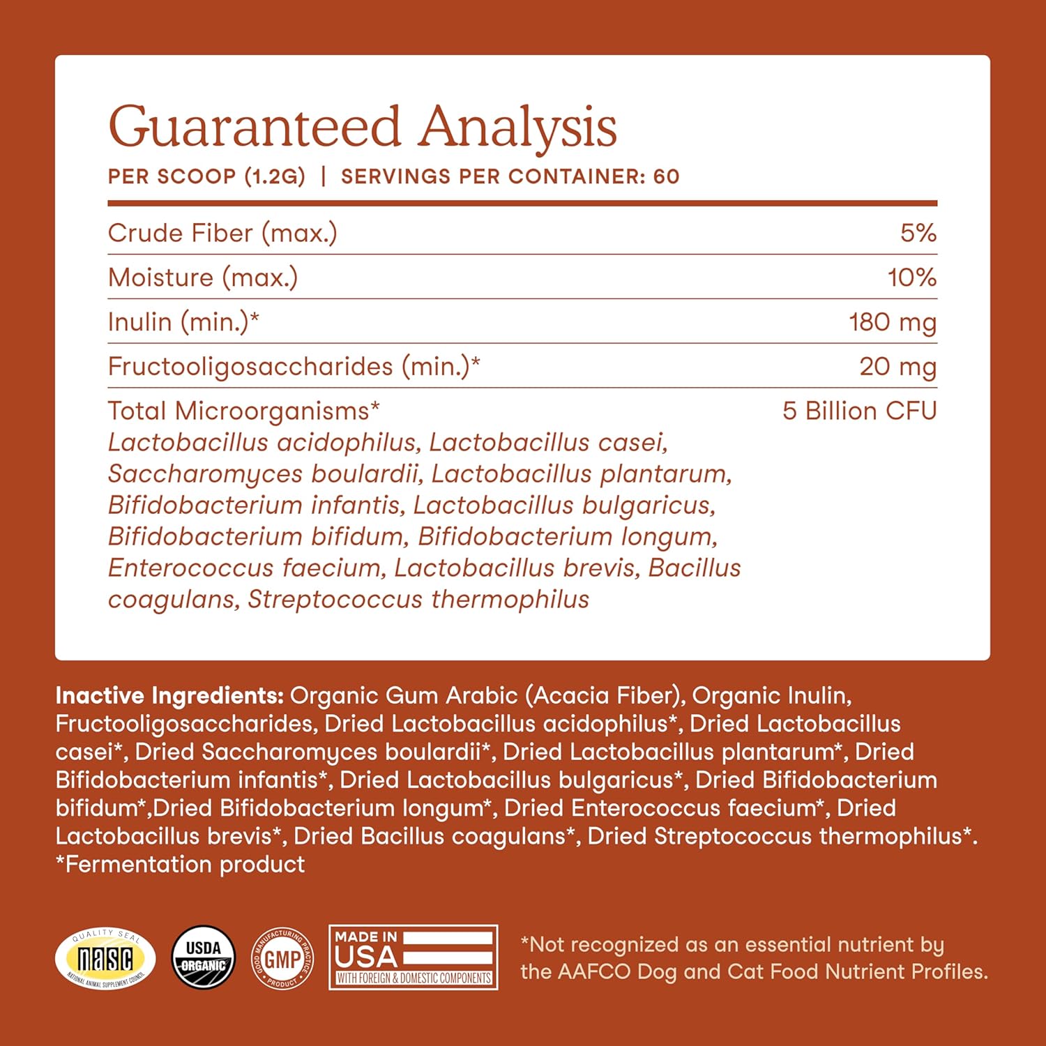 - No fillers: This certified organic dog and cat probiotic is formulated with 12 strains (5 billion CFUs per scoop) and organic prebiotics (acacia, agave inulin and fructooligosaccharides) for a balanced digestive tract