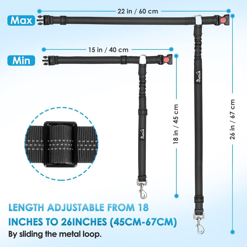 - Adjustable Seatbelts --- With a buckle and the elastic bungee inside, the seat belt can be adjusted from 20 inches to 27 inches and stretched to a maximum length of 32 inches. The circle can be adjusted from 16 inches to 24 inches. An adjustable car seat belt harness allows the dog to get comfortable without limiting himself.