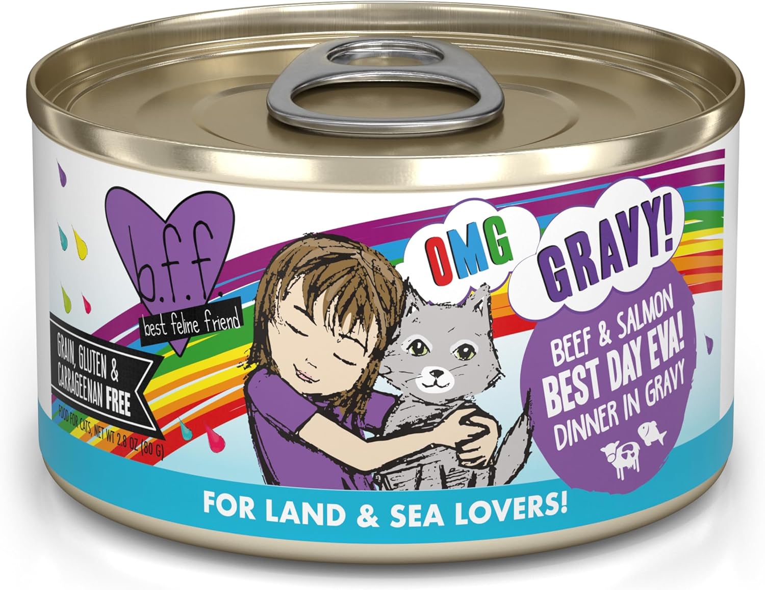 Weruva B.F.F. OMG - Best Feline Friend Oh My Gravy!, Best Day Eva! with Beef & Salmon in Gravy Cat Food, 2.8oz Can (Pack of 12)