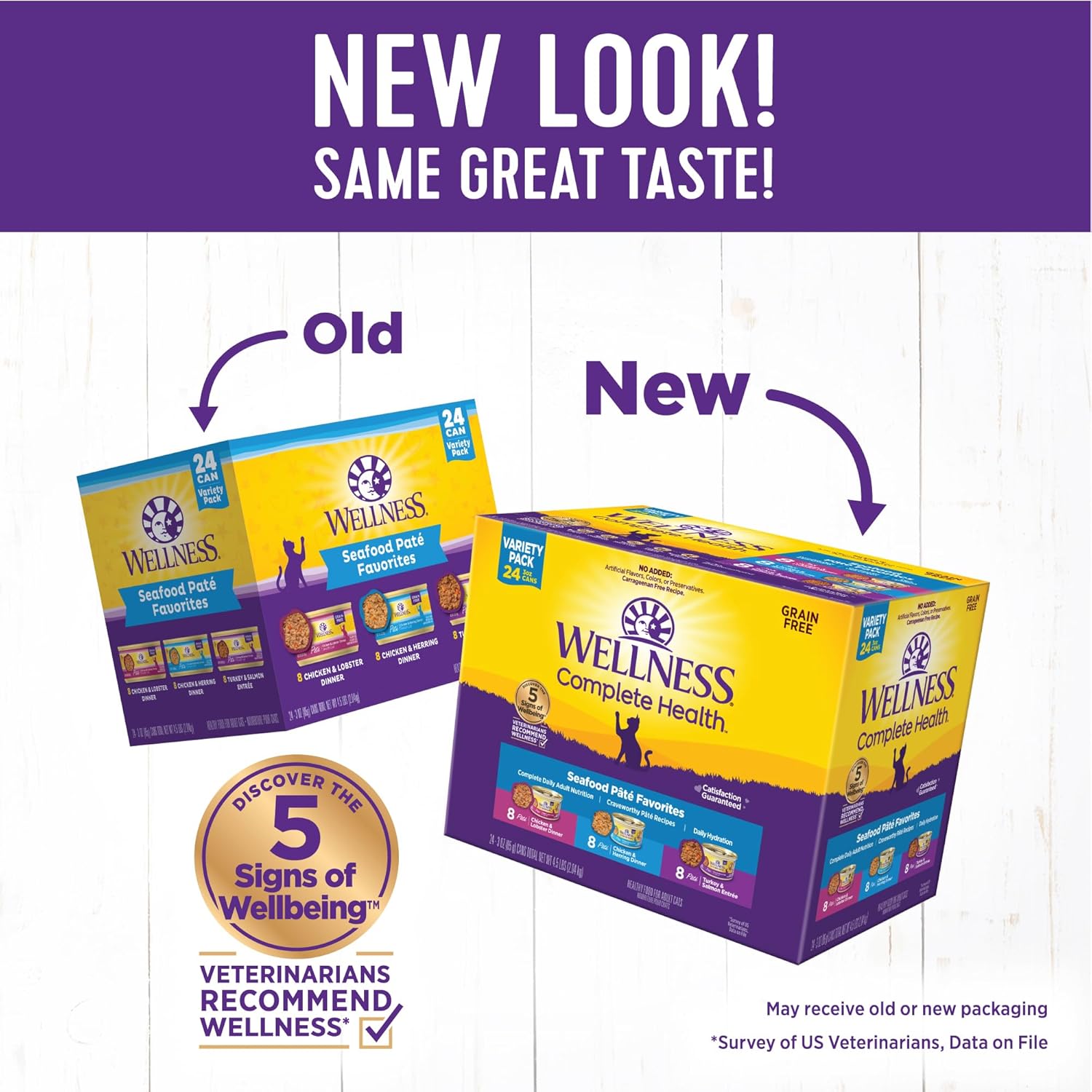 Wellness Complete Health Pate Adult Wet Cat Food, Natural, Protein-Rich, Grain-Free, 3 Ounce, 24 Pack, (Seafood Favorites Variety Pack)