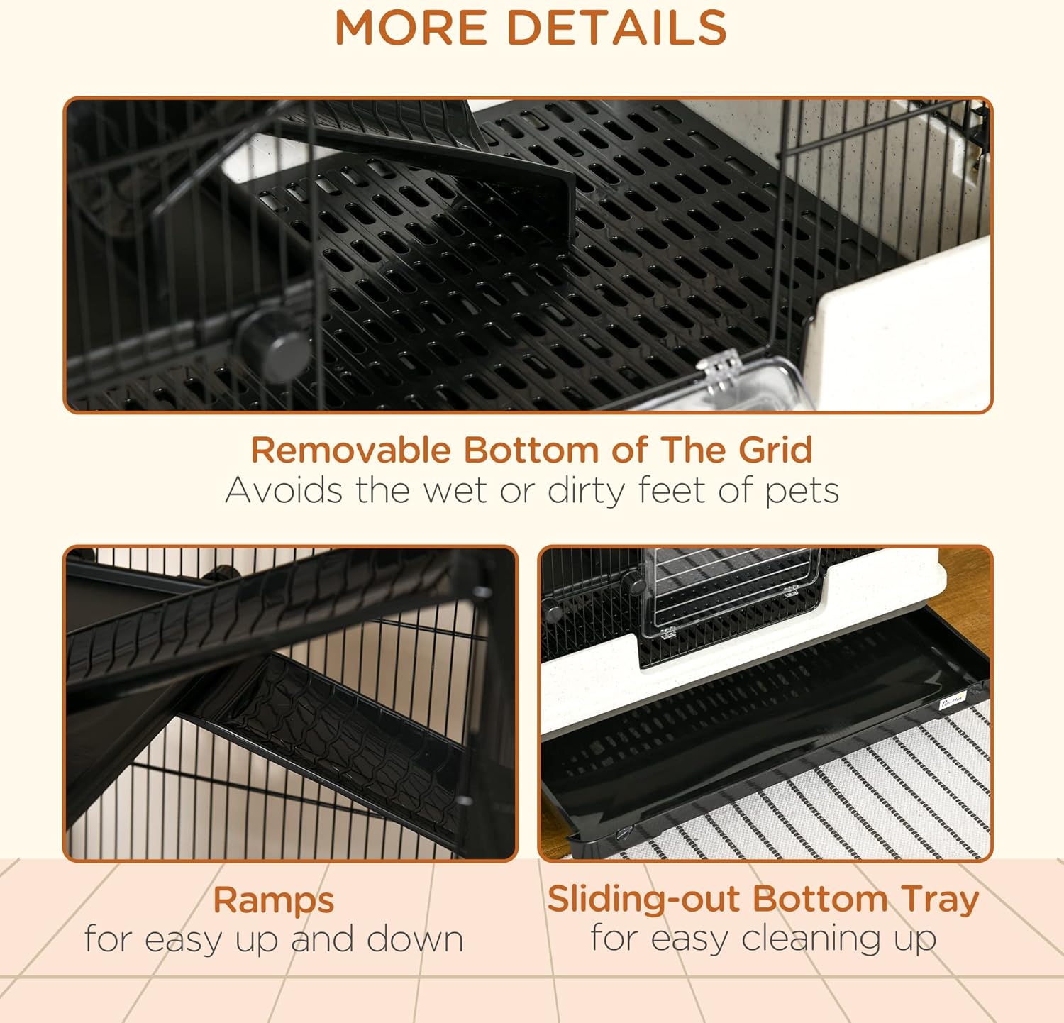- Multiple Features: This chinchilla cage home for your small pet provides them with a platform and ramp for easily moving up and down. The bottom of the grid avoids the wet or dirty feet of small animals too.