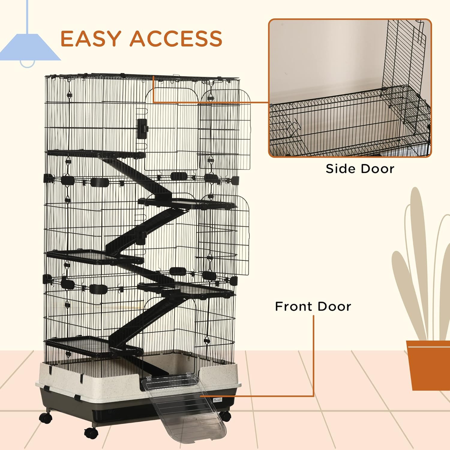 PawHut 59.5" Small Animal Cage with Wheels, 6-Level Portable Bunny Cage, Chinchilla Ferret Cage with Removable Tray, Platform and Ramp