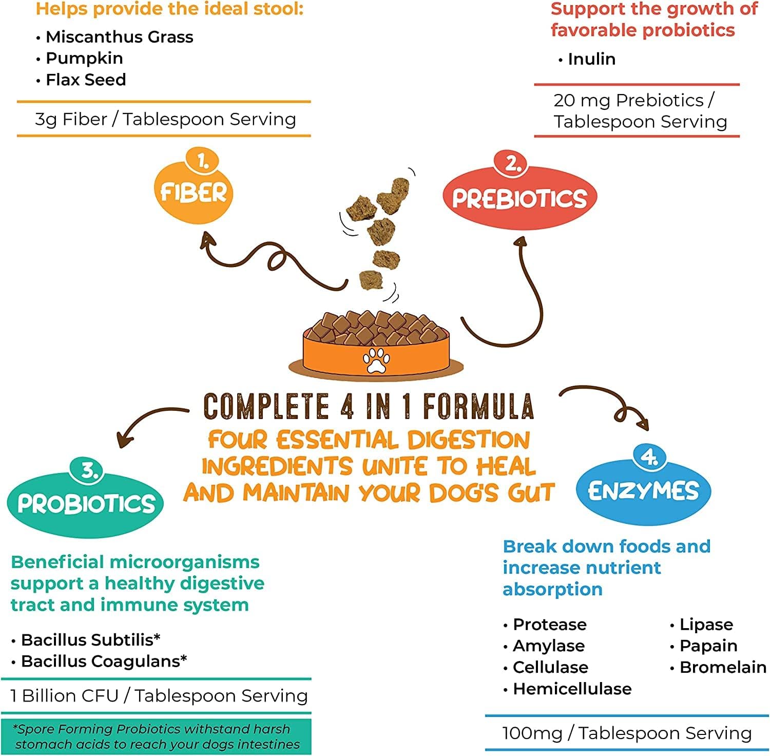 - COMPLETE 4 IN 1 FORMULA: Combines premium Fibers, Prebiotics, Probiotics and Enzymes to supercharge your pet's digestive system. These four building blocks unite to form a high fiber solution that heals and maintains your dog's gut
