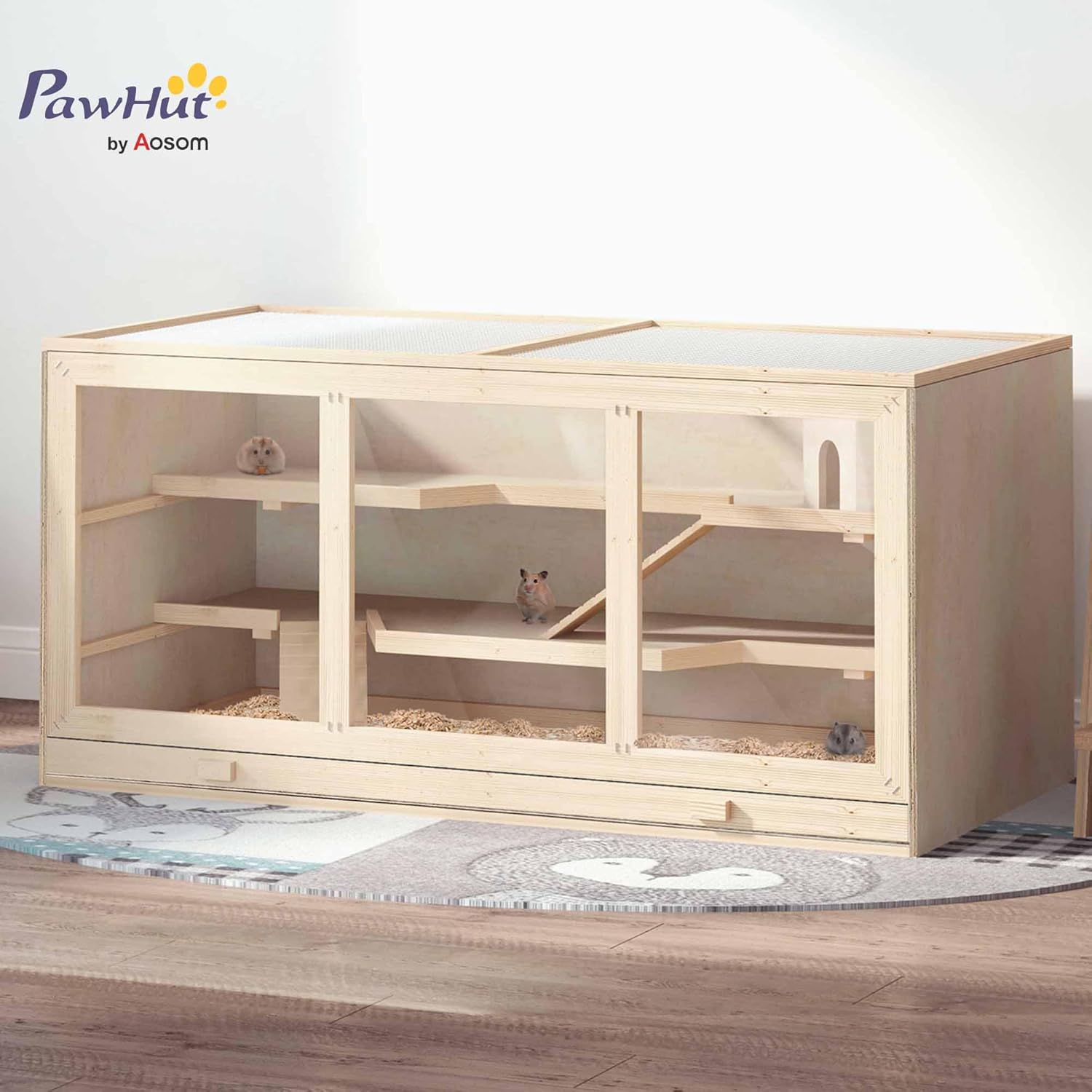 PawHut 45" Extra Large Wooden Hamster Cage, 3-Layer Chewproof Rat Cage with Opening Roof, Hut, Ramps, for Gerbil, Dwarf & Syrian Hamsters, Natural