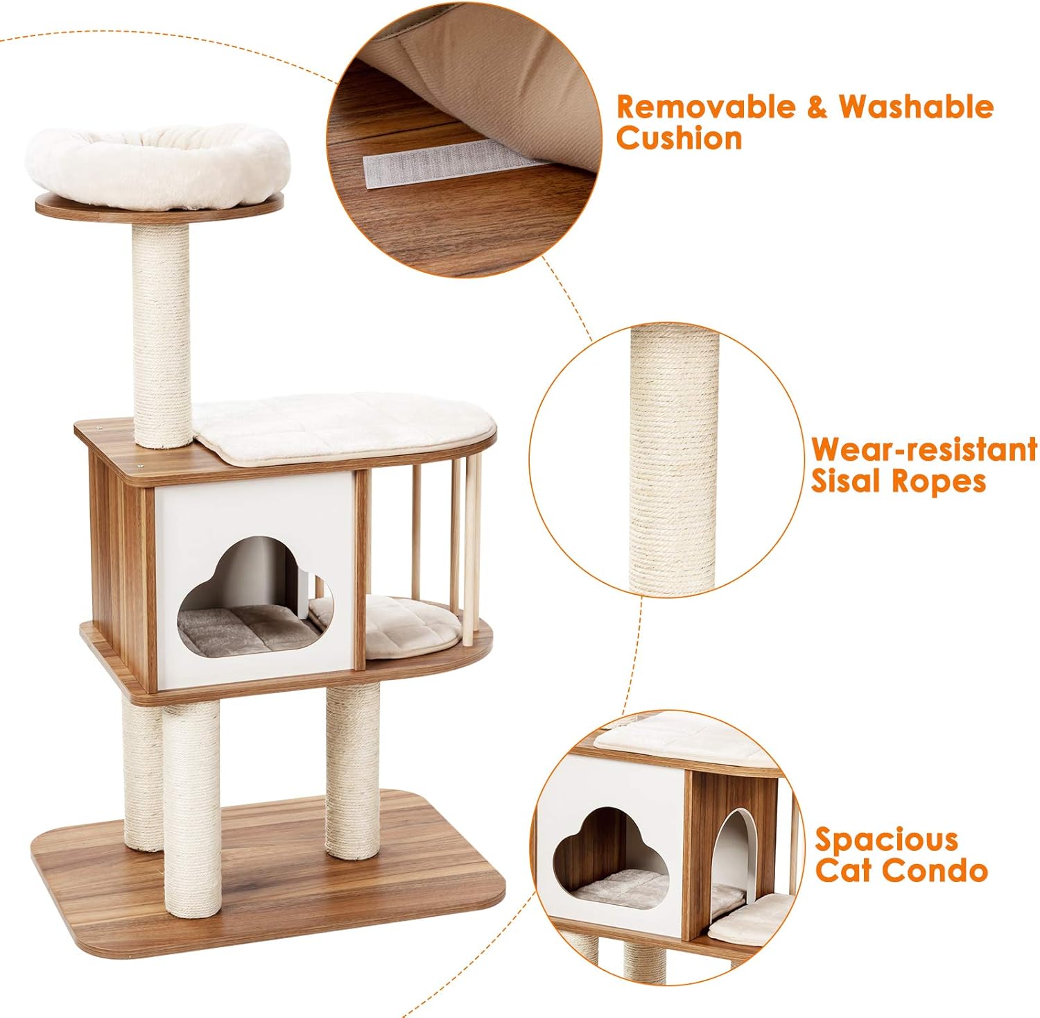 - Protect Your Home: With durable and wear resistant sisal ropes, this premium cat tower satisfies your feline friends’ instinct of scratching while preventing your furniture from damage. And the cushions are soft for maximum comfort and can be removed for washing.