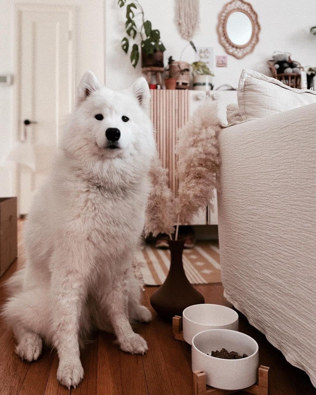- Double Bowl Design:One dog bowl for food and one for water, Each ceramic cat bowl has a Unique wooden stand, raising the dishes closer to your pet for more comfortable eating