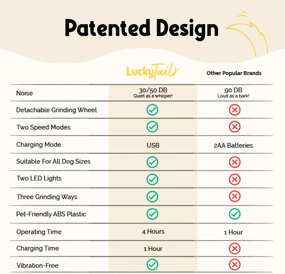 - Patented Design: With our unique and innovative design, we created the gentlest and quietest electric nail grinder for dogs and cats. At 30 - 45 DBs our dog and cat nail grinder omits half the sound compared to popular competitors at 110 DBs. You and your furry bestie can finally say goodbye to stressful nail trims.