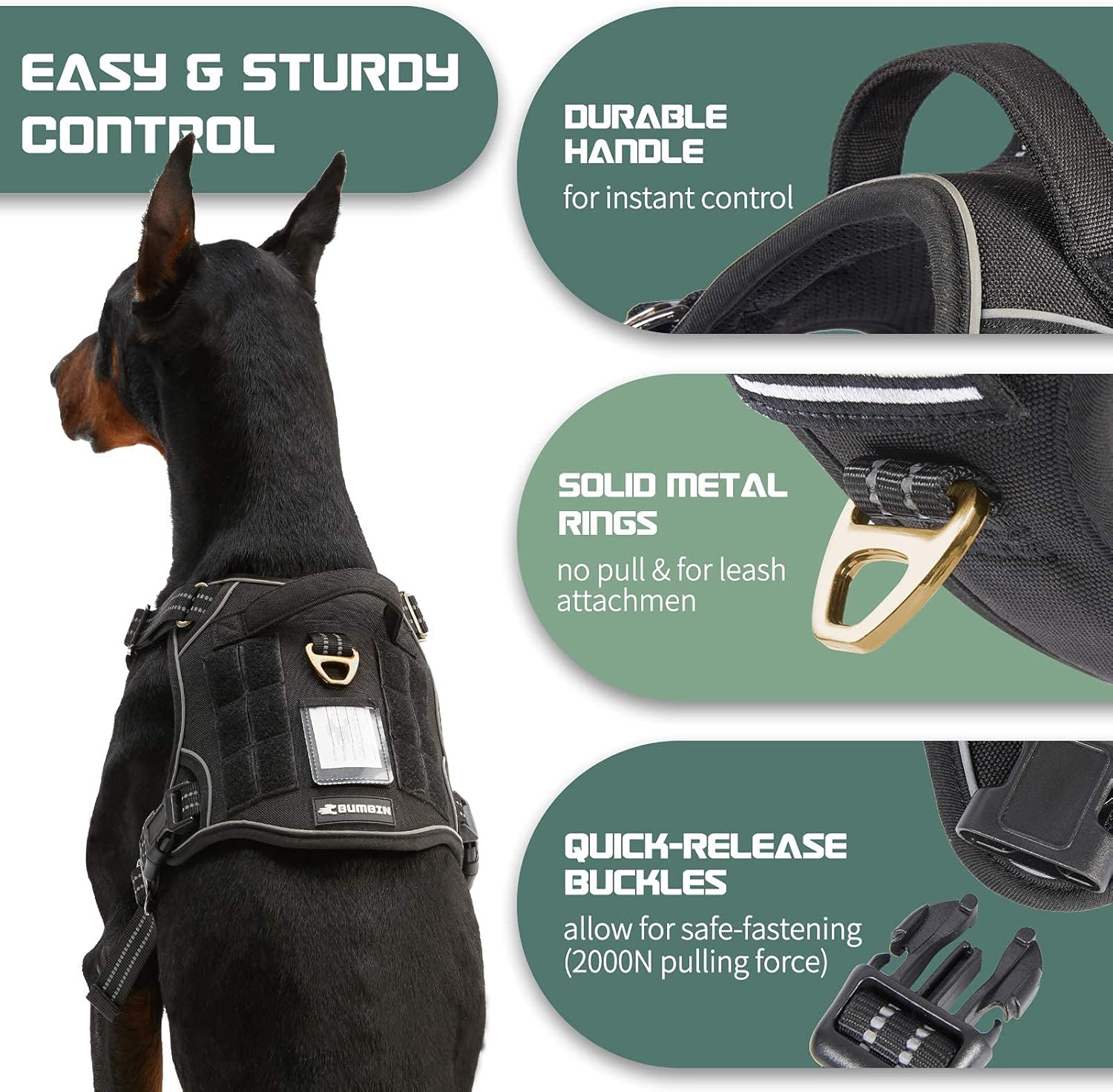 - 🐾NO PULL & STURDY BUCKLES: Provide better dog harness for dogs.🐾 Bumbin dog harness is equipped with 2 Sturdy Metal D-Rings for connecting the leash, reinforced on the extensional part. One Front Clip for No Pull control or dog training. One Back Clip for casual walking or jogging. Our plastic buckles withstand 2000N pulling force to ensure it won't be easily damaged. Recommended Large Dogs, such as Shepherd, Newfoundland, Doberman, Labrador, Alaska, German Shepherd, Large Bulldog, etc.