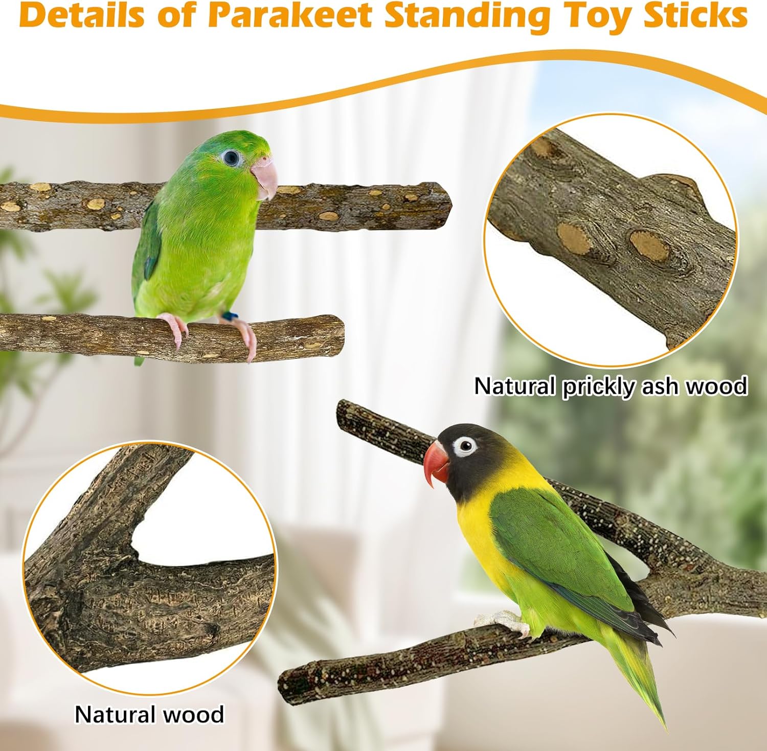 - [HEALTHY MATERIALS] The perches are made of natural wood and prickly ash wood no paint, no chemical smell, and are very safe for pets. The surface of the perches is not smooth, allowing the parrot to stand comfortably without slipping