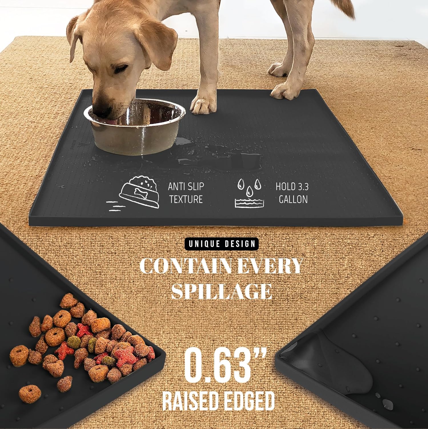 - Mess-Free Feeding: Tired of messy eaters? Our redesigned 32x24'' pet placemat for food and water, with a 0.63" high and firm raised edge, corrals kibbles and water for easy cleanup. No more spills, just happy feeding for your pets
