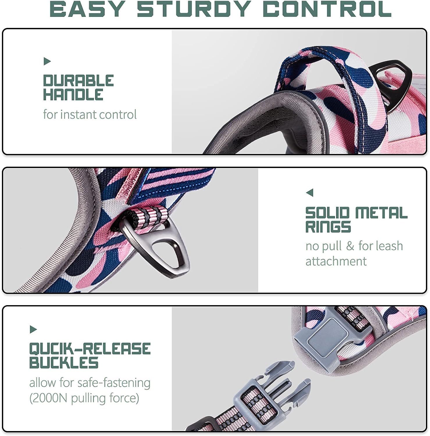 - 🐾NO PULL & STURDY BUCKLES: Provide better dog harness for dogs.🐾 Bumbin dog harness is equipped with 2 Sturdy Metal D-Rings for connecting the leash, reinforced on the extensional part. One Front Clip for No Pull control or dog training. One Back Clip for casual walking or jogging. Our plastic buckles withstand 2000N pulling force to ensure it won't be easily damaged. Recommended Large Dogs, such as Shepherd, Newfoundland, Doberman, Labrador, Alaska, German Shepherd, Large Bulldog, etc.