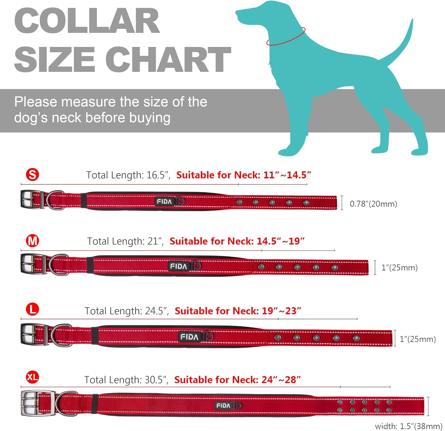 Fida Heavy Duty Dog Collar 1.5” Width, Ultra Soft Neoprene Padded, Adjustable Reflective Nylon Pet Collar with Two Metal Pin Belt Buckle for Large/X-Large Breeds (XL, Red)