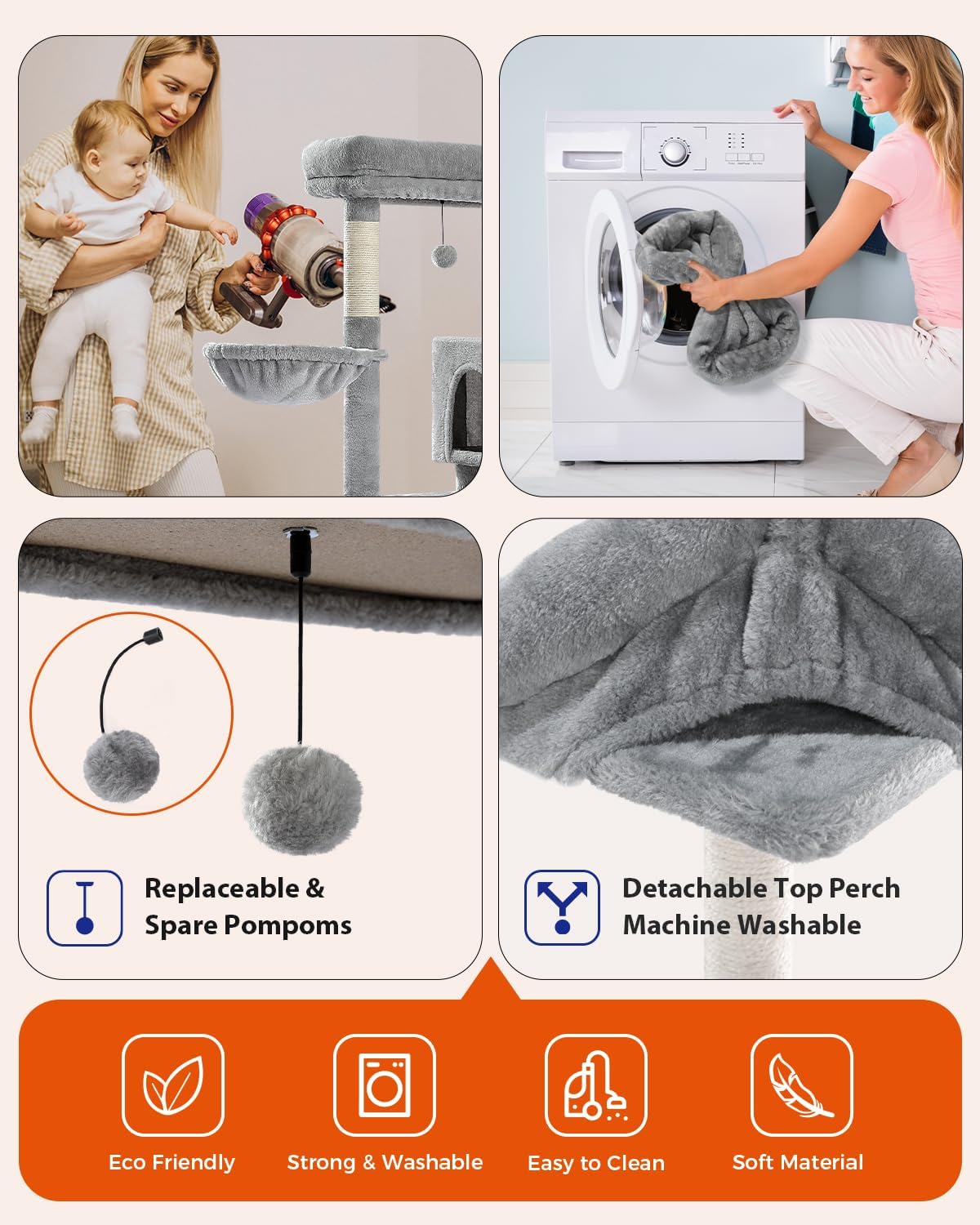 - Ultimate Activity House: Equipped with a roomy condo, spacious hammock, cozy plush top perch, natural sisal covered scratching posts and fluffy dangling ball, this 56.3’’ cat tree is an ideal place for entertaining as well as taking a good rest. Your frisky kittens could easily jump up and down with the assist of the round pedal and step-like layout