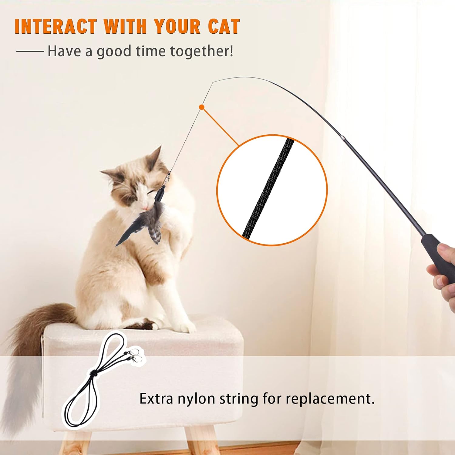 - 【TELESCOPIC POLE】 The cat toy wand can extend up to 38 inches, long distance can help save the hands from the cat's paw scratches. It's also can be contracted to 15 inches and make storage easy. This stick cat toy with a foam handle is lightweight and flexible which can make the hands more comfortable.