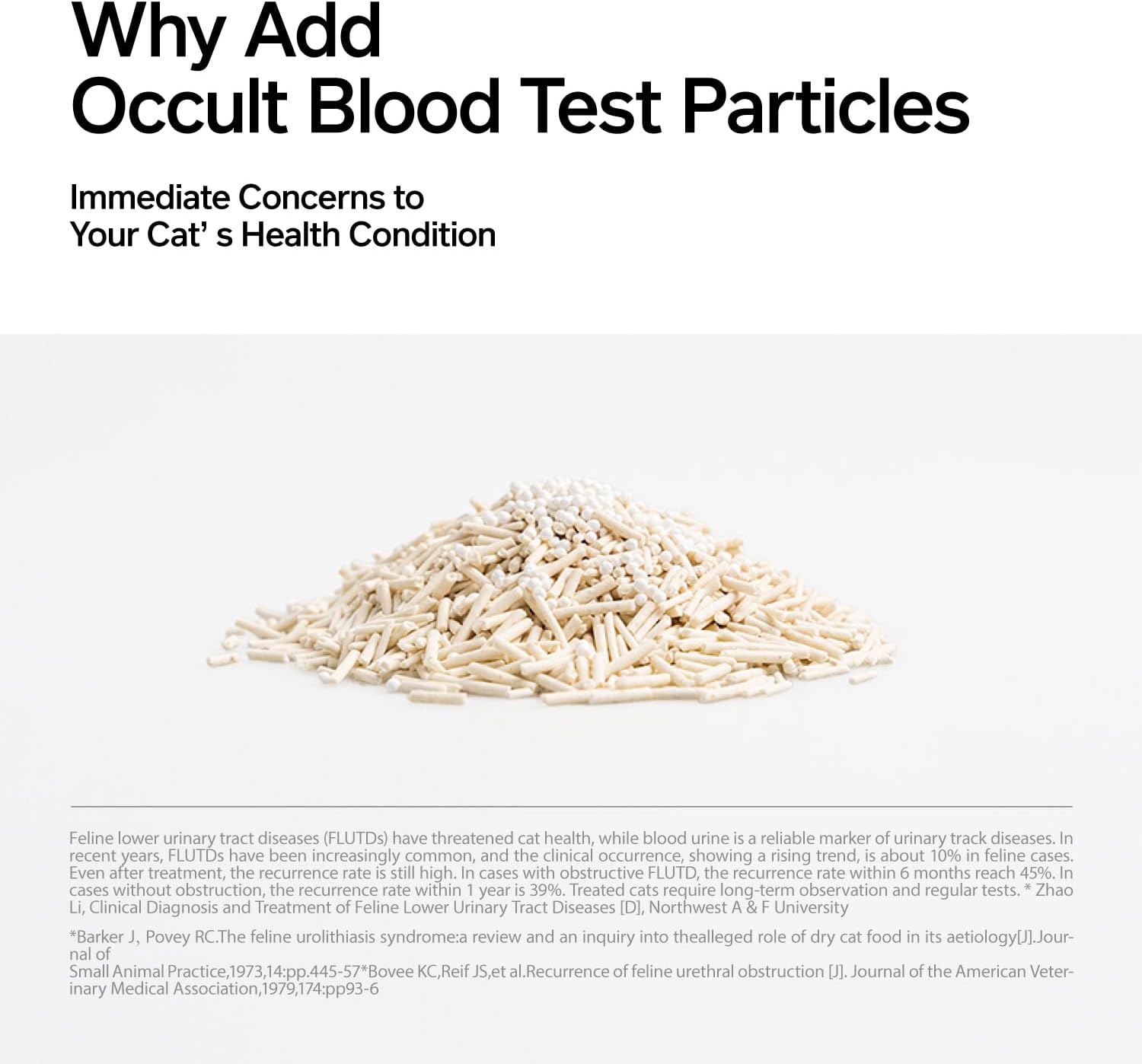 - 【Attention】 1.Direct exposure to hard light or friction with metal would invalid the detection function of the occult blood test particles. Please avoid such situations.2.Mineral substance contained in bentonite would affect the detection performance. Do NOT mix the product with other cat litter. 3.The vacuum design is only to facilitate its transportation and storage, and air leakage does NOT compromise the use. If you DO mind, please contact us.