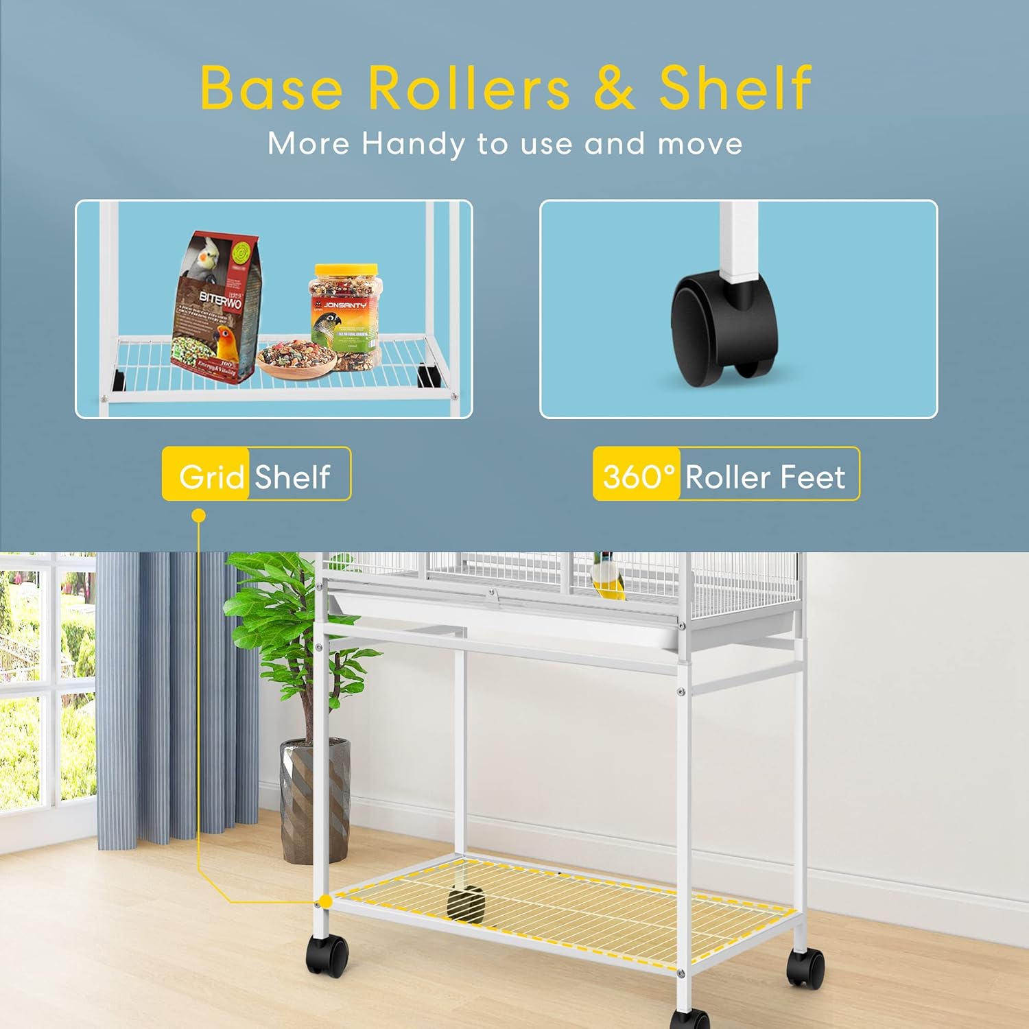 - CONSIDERATE DESIGN - With the design of the considerate 4 universal casters, you can put the cage where you want and it will not run anywhere; The unique latch design is firm and safe, which can prevent the bird from opening the door by themselves and ensure the protection; The perch is designed to fit the size of a bird's feet and the breeding box can be hung on either side of the cage