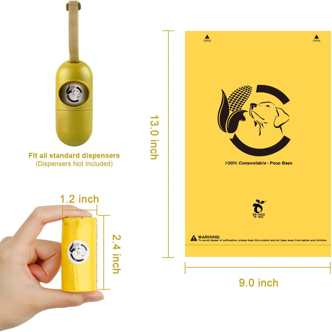 Certified Compostable Dog Poop Bags, 270 Count Landfill Friendly and Leakproof Waste Bags, Easy Open Unscented Maize Yellow Poop Bag for Dog, 15 Doggy Bags Per Roll (18 rolls)