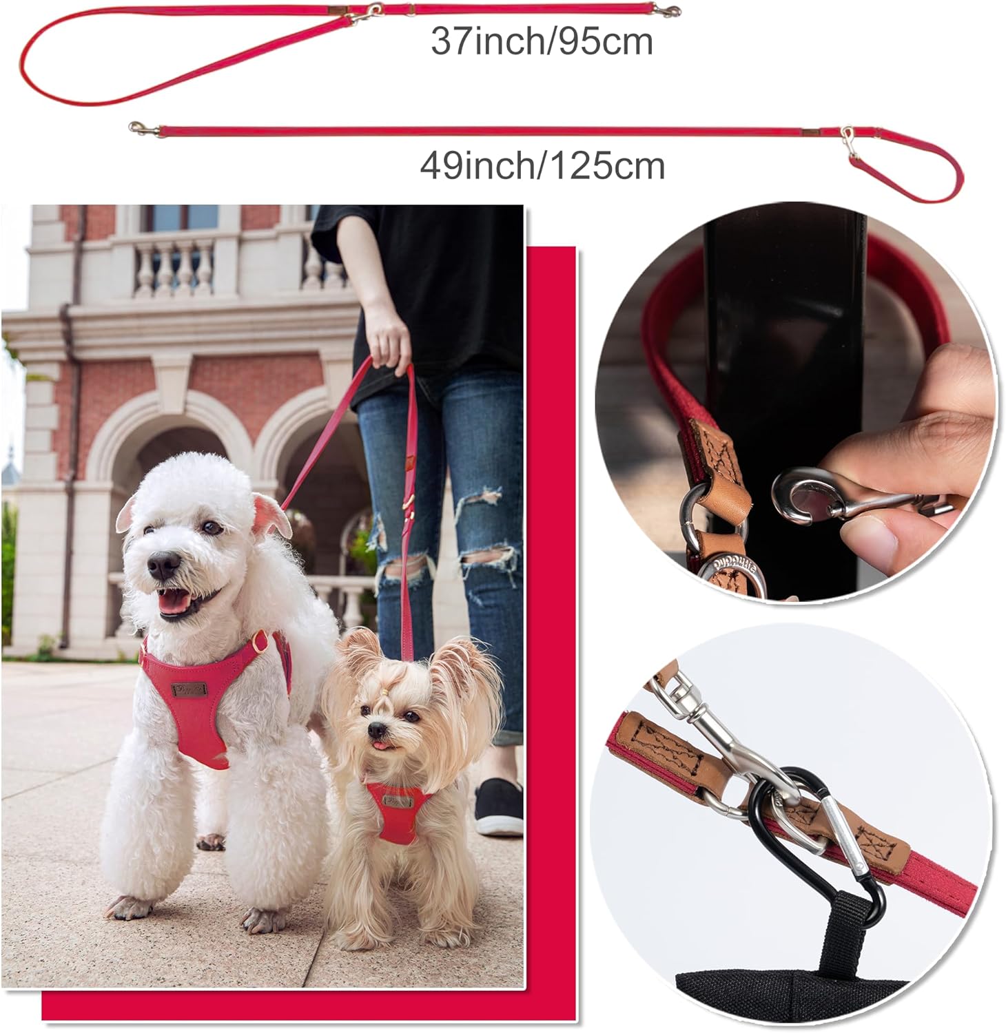 - Dog leash:Puppytie’s dog harness is equipped with a multi-functional leash, which can be adjusted in two lengths of 49inch and 37inch. You can use it to easily carry two dogs out. It has the function of carrying keys or garbage bags. The function of wait in place allows dogs to wait in place quickly and safely