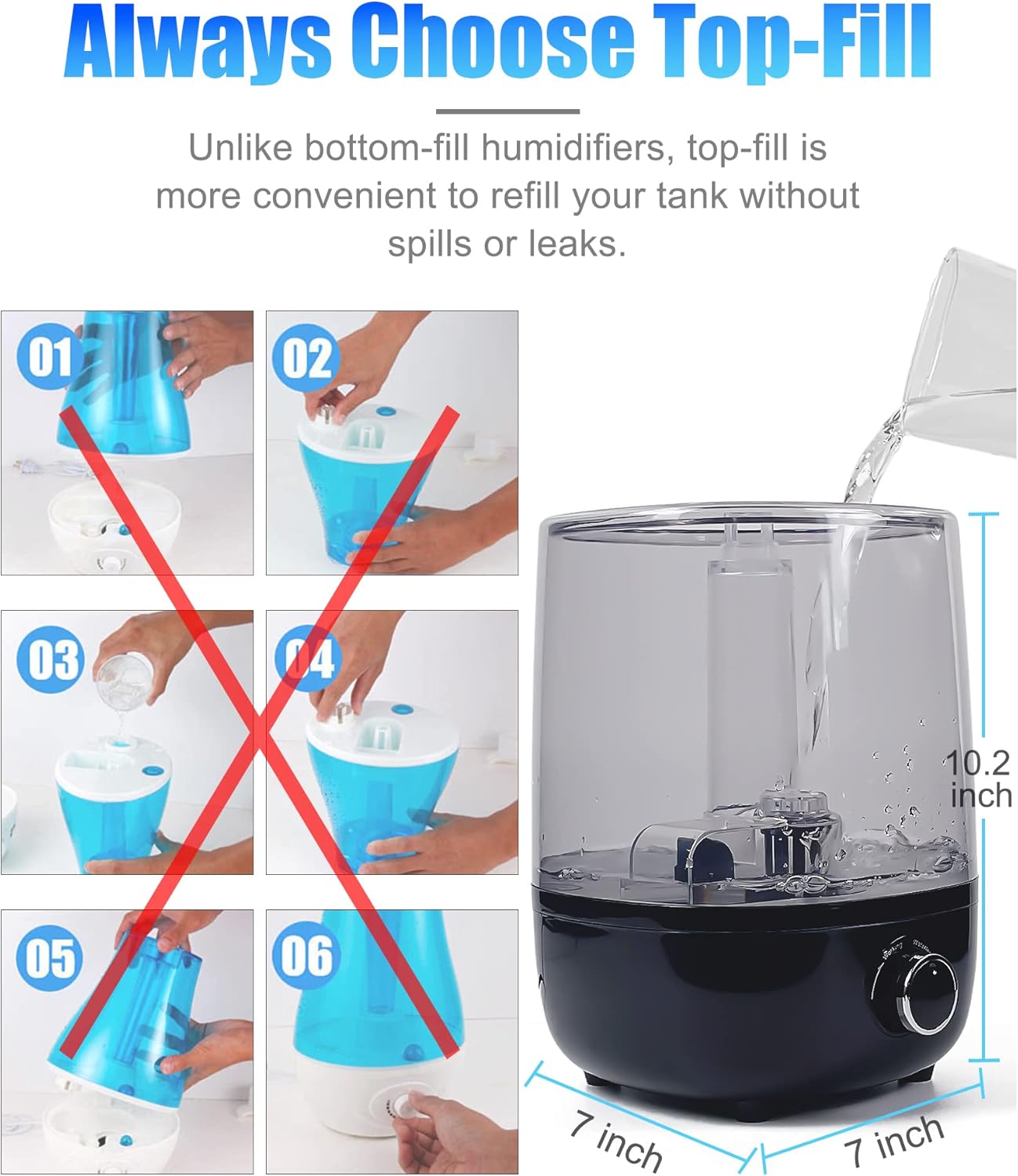 - 【Top filling & Easy clean】 The lid can be removed easily for cleaning or filling, it is easy to add water from the top instead of turning over the tank. The large opening makes it easy for refilling and daily cleaning of every corner to last the lifetime . Please clean the humidifier regularly every month.