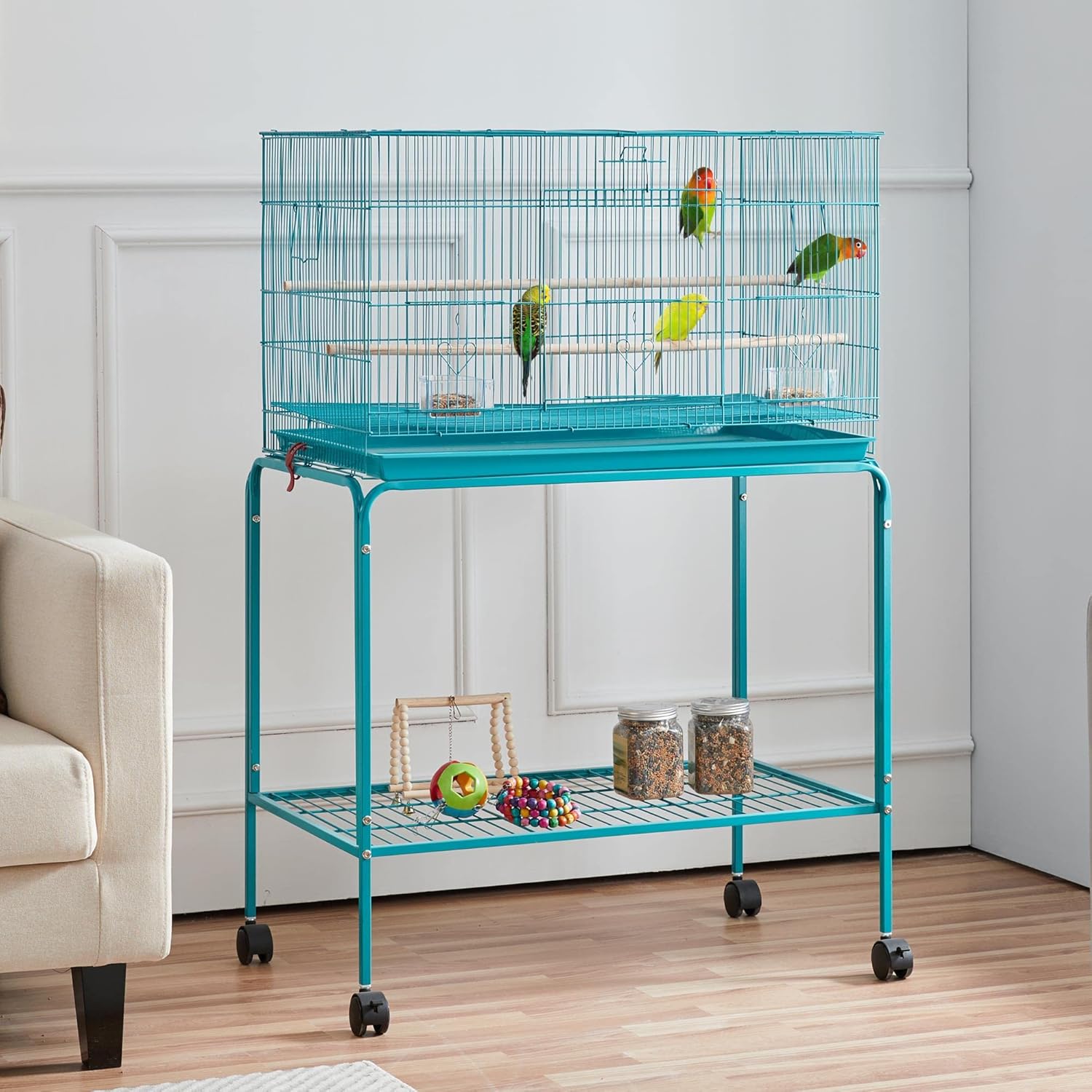 - Rolling stand with shelf: Rolling casters and safety wheel brakes of this flight cage provide your lovely birds a chance to move around the house, and they can even stay outside with sunshine when the weather is so fine. The bottom area designed for storage purposes helps you to sort seeds and cleaning tools out with ease