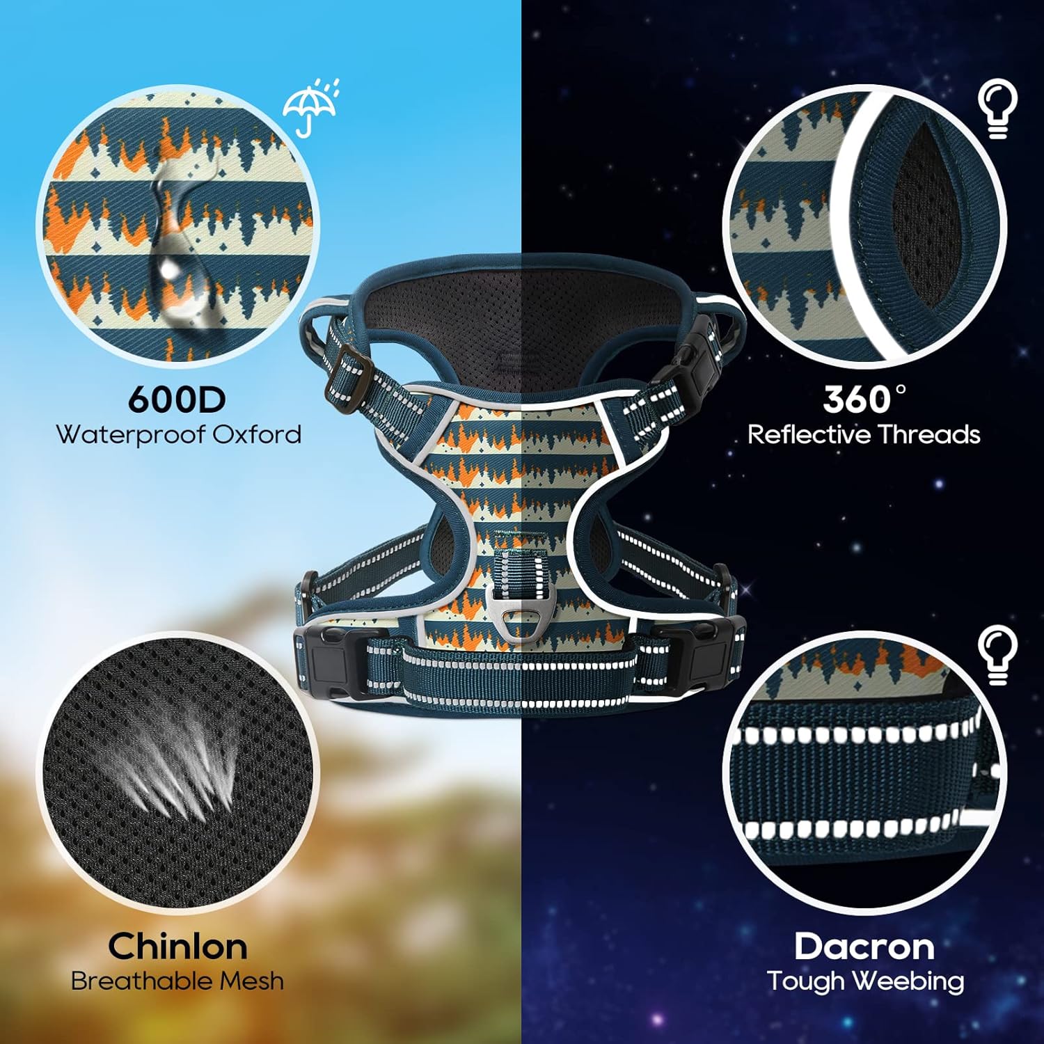 - 【MUCH SAFER & MORE COMFORTABLE】 Breathable mesh lining with soft sponge padding plate of puppy harness prevents injuries, giving extra comfort and protection with enhanced 1600D oxford fabric. The reflective material will be really nice when it gets dark. Also, your dog will be saw easily. This reflective material can make drivers have long time to react, which ensure your dog’s safety!