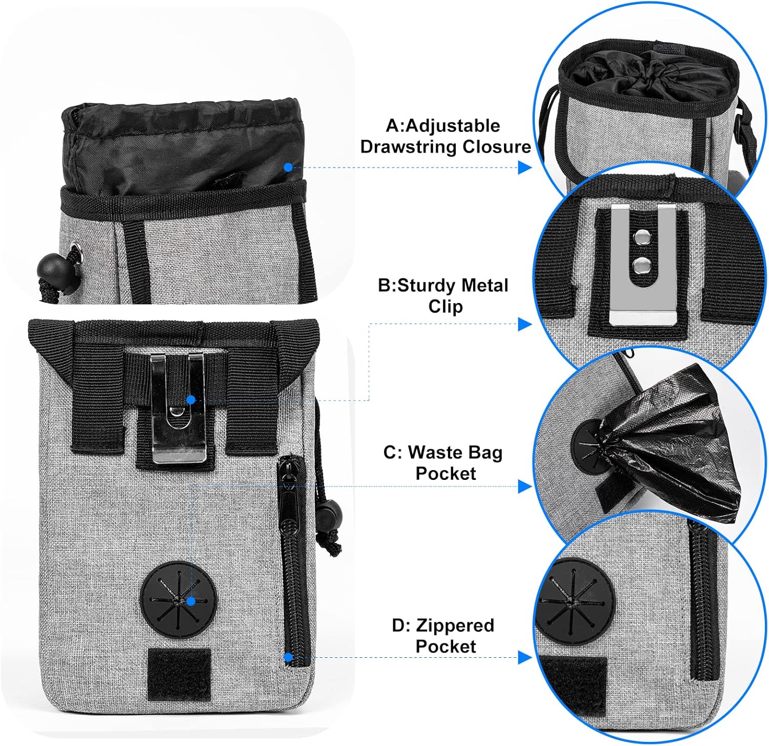 - Dog Travel Accessories: two detachable pet training bags make the pet organizer more functional.The on-the-go dog treat pouch can carry your dog's favorite treat and toys.With big opening and drawstring closure allows quick access to pouch with one hand.You can also securely store your personal belongings, such as phone, keys, or wallet in the pouch.Perfect choice for dog training at the park.