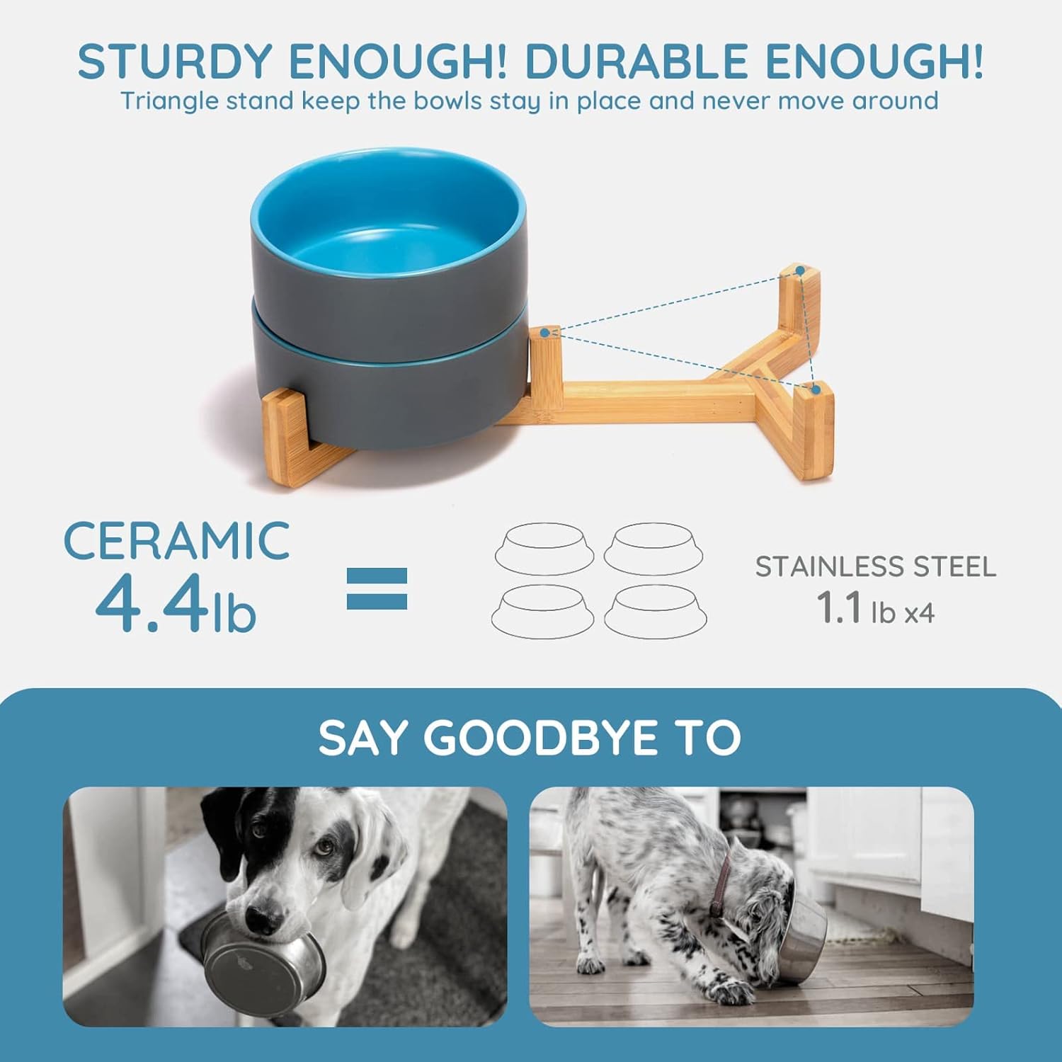SPUNKYJUNKY Ceramic Dog and Cat Bowl Set with Wooden Stand, Modern Cute Weighted Food Water Set for Small Size Dogs (13.5OZ) & Medium Sized Dogs (28.7OZ) & Cats (3.6 Cups, 2 × Blue-Grey)