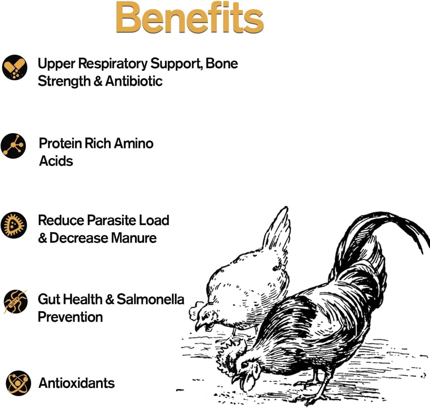 - 𝗡𝗮𝘁𝘂𝗿𝗮𝗹 𝗙𝗲𝗲𝗱 𝗦𝘂𝗽𝗽𝗹𝗲𝗺𝗲𝗻𝘁 - provides a healthy ratio of critical minerals, fatty acids, and protein-rich amino acids, which quickens the molting process, strengthens eggshells of flocks.