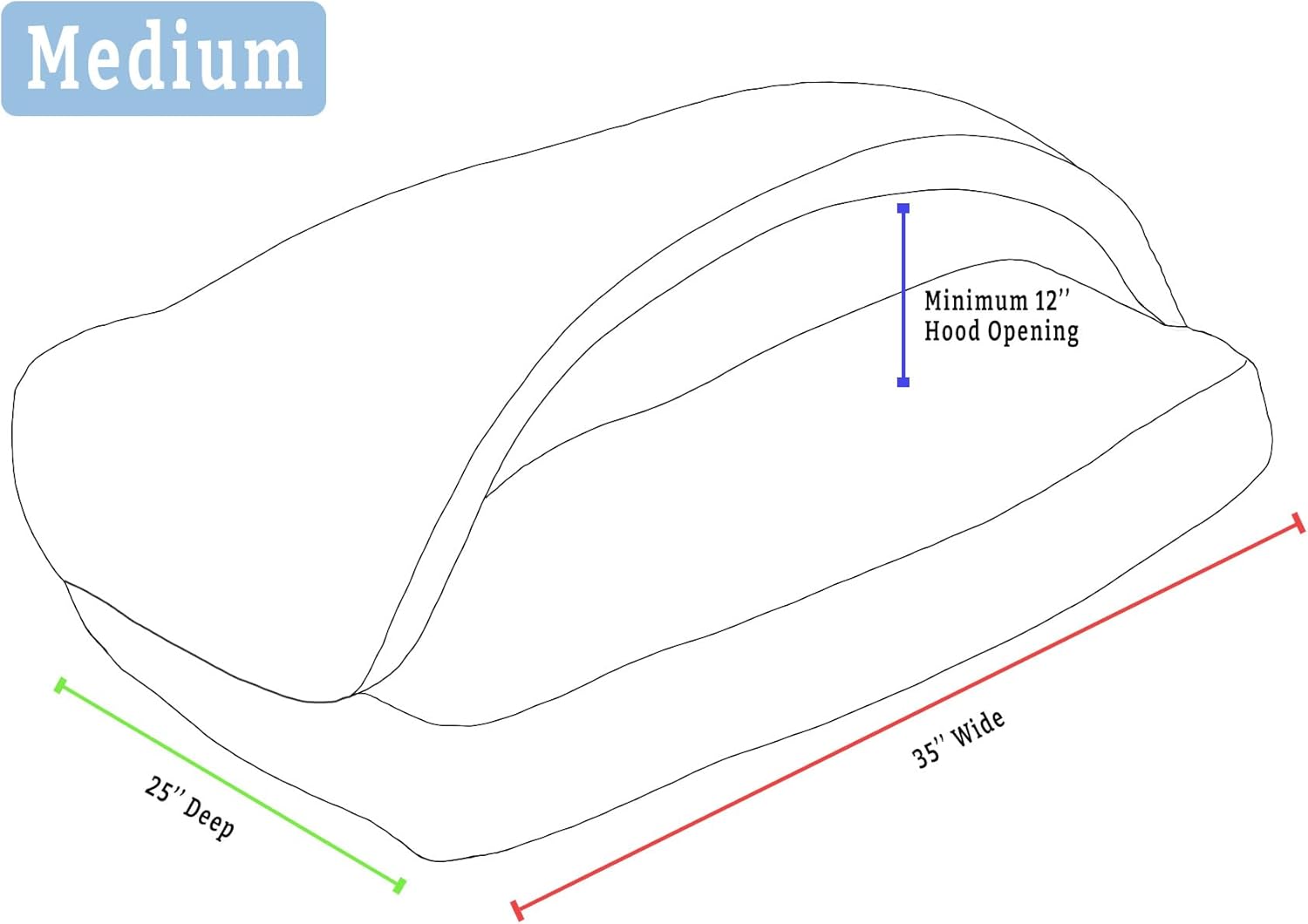 - SIZING: This Medium Rectangle Cozy Cave measures 25” x 35” and has an approximate hood opening height of at least 12”. A thin removable plastic tube keeps the hood open for easy entry or exit and can be removed through the small hole at the corner of the hood for a looser, blanket-like structure. This size Medium provides space for mid-sized breeds while creating a snug, enveloping feel.
