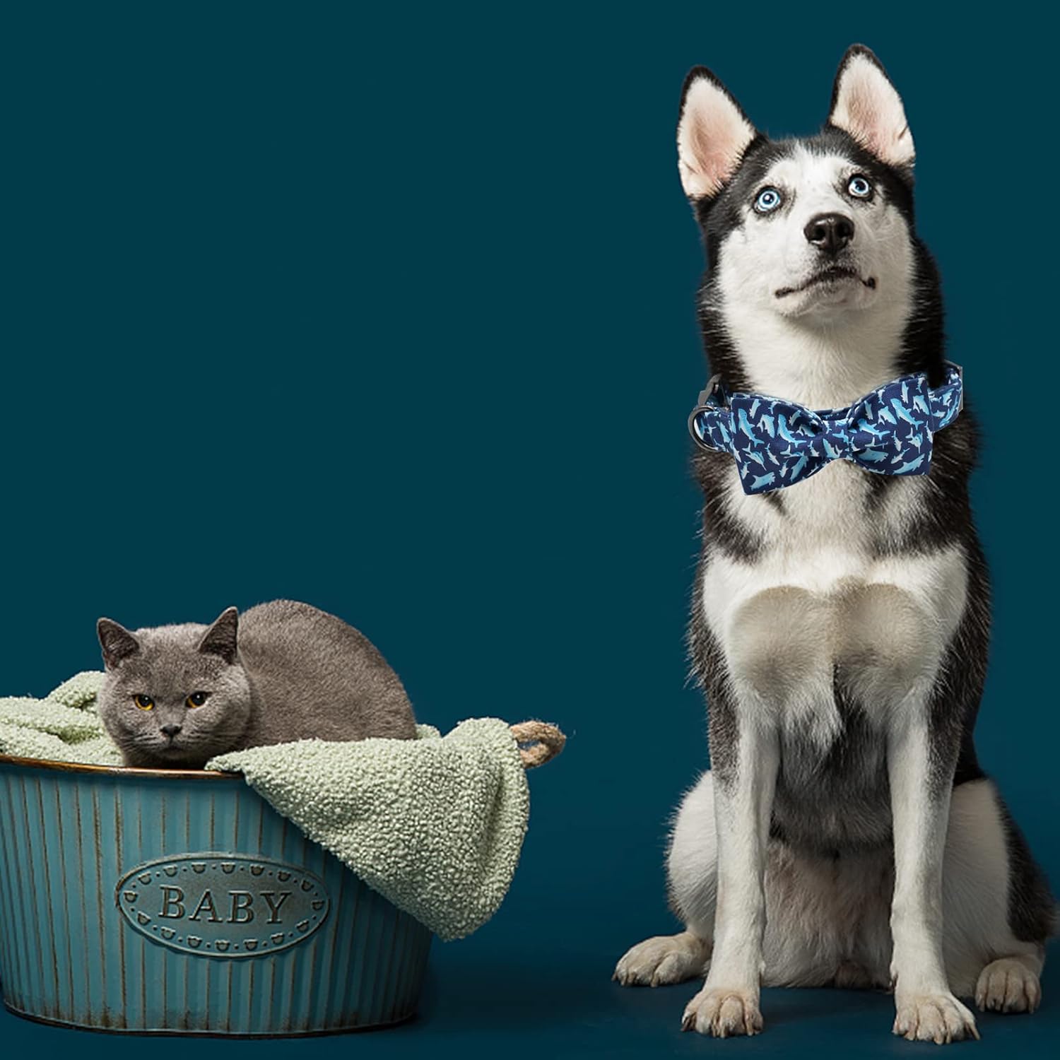 Elegant Little Tail Bowtie Dog Collar - Shark Print, Adjustable for Small Dogs