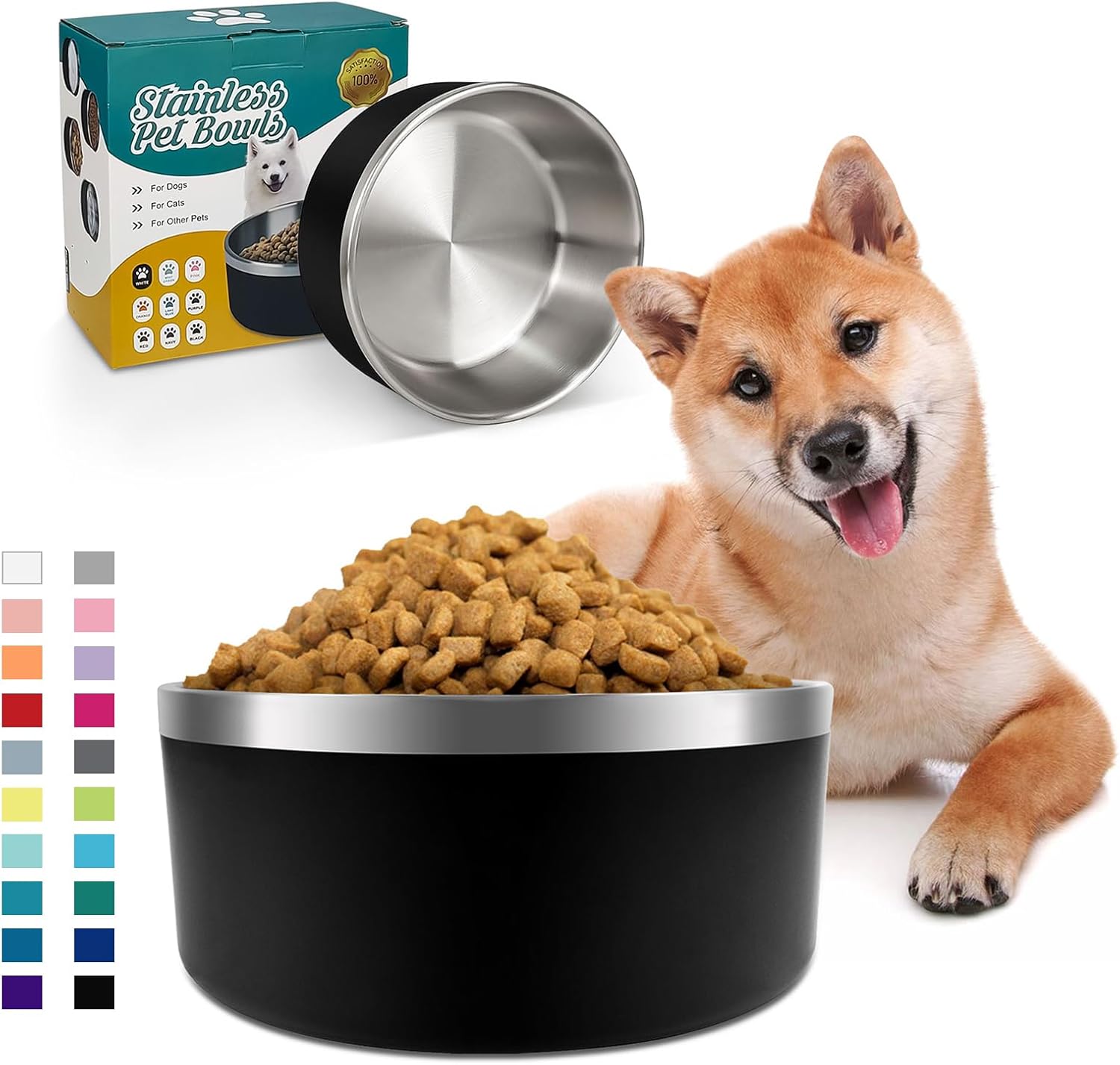 IKITCHEN Dog Bowl for Food and Water, 64 Oz Stainless Steel Pet Feeding Bowl, Durable Non-Skid Double Wall Insulated Heavy Duty with Rubber Bottom for Medium Large Sized Dogs (64 Ounces/8 Cup, Black)