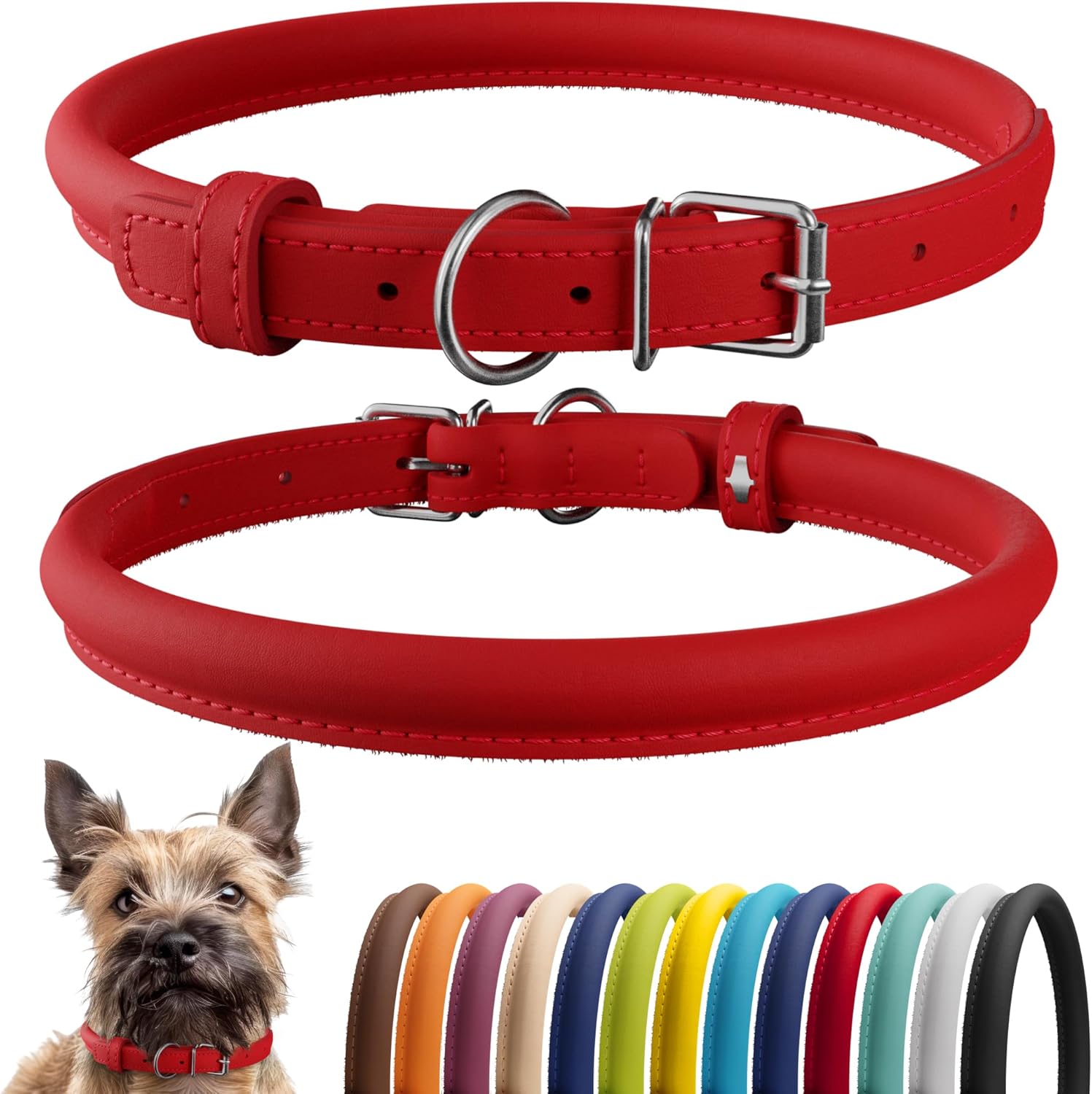 CollarDirect Rolled Leather Dog Collar, Soft Padded Round Puppy Collar, Handmade Genuine Leather Collar Dog Small Large Cat Collars 13 Colors (6-7 Inch, Red Smooth)