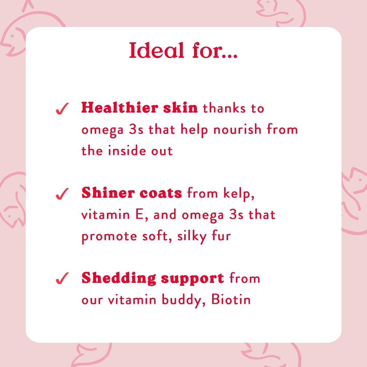 - Let’s help give your dog’s coat a healthy (and extra shiny!) boost. A daily nutritional supplement to support healthy skin and a silky coat. Our formula (with tasty, USA salmon!) includes vitamin E and essential fatty acids, too.