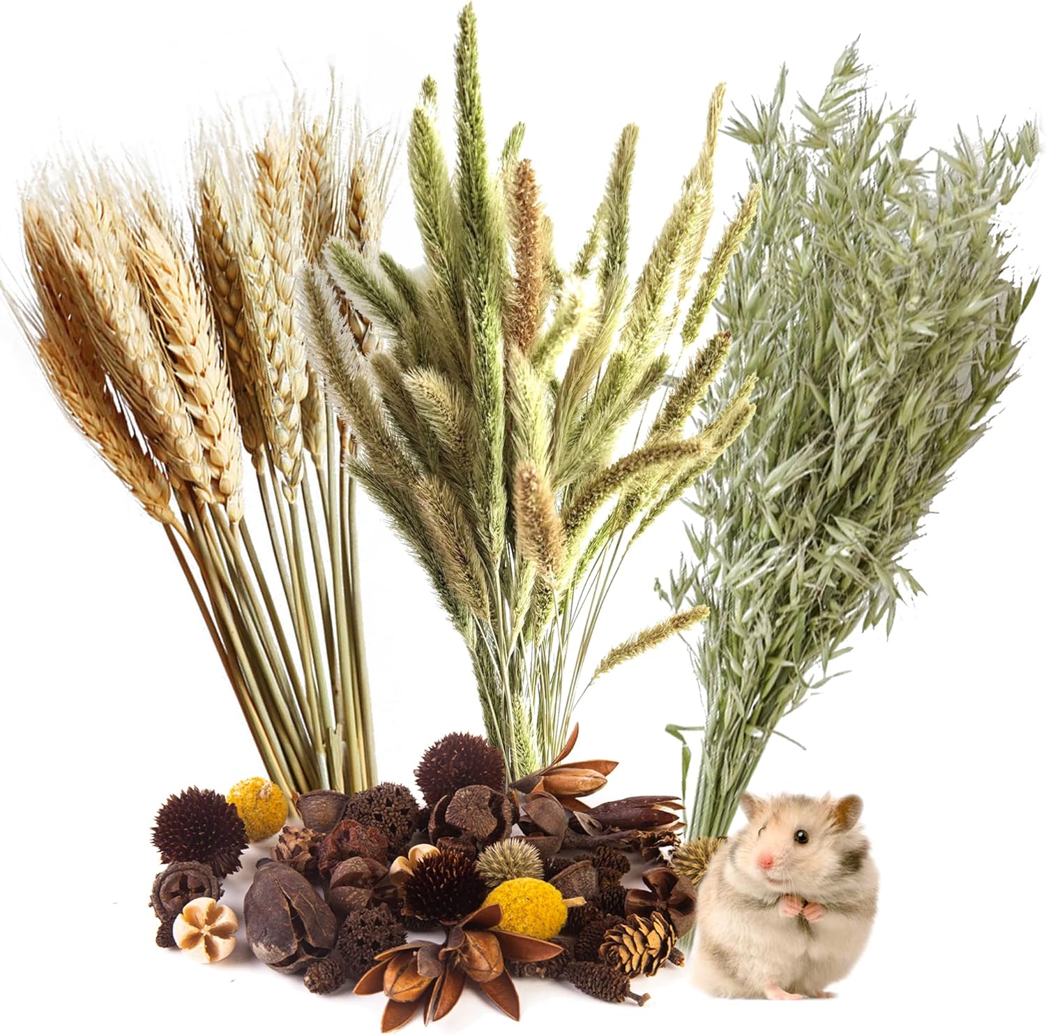 - What You Get: What you get: 1*box dry fruits , 15* oat, 20* ear of wheat and 50g foxtail. These grain ears not only redecorate the hamster's home, but also provide more hamster toys to enrich their experience.