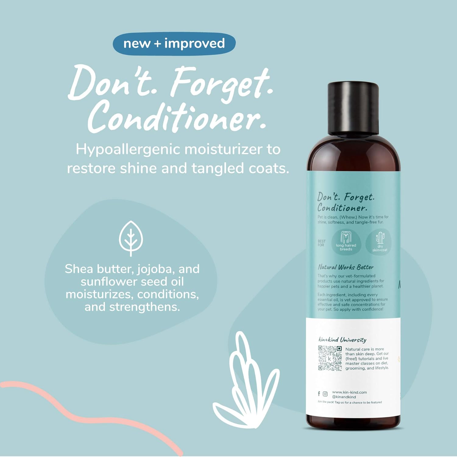 - MOISTURIZING CONDITIONER: Our Moisturizing Conditioner for Dogs and Cats is made with ingredients that are suitable and ideal for your furry friends. Our pet conditioner has shea butter, jojoba, and sunflower seed oil to help your pet’s coat be extra soft, and shiny.