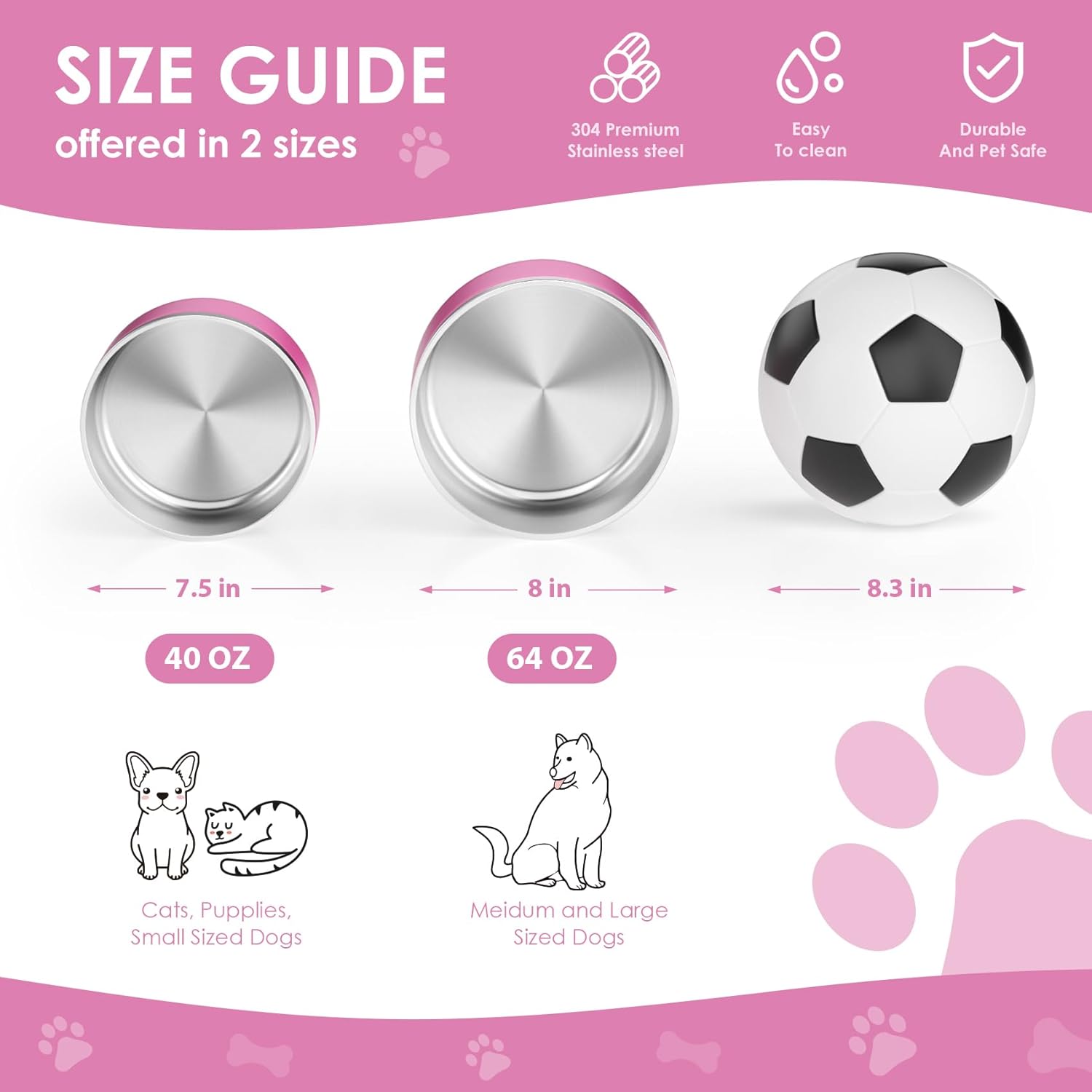 IKITCHEN Dog Bowl for Food and Water, 64 Oz Stainless Steel Pet Feeding Bowl, Durable Non-Skid Double Wall Insulated Heavy Duty with Rubber Bottom for Medium Large Dogs (64 Ounces/8 Cup, Pink)