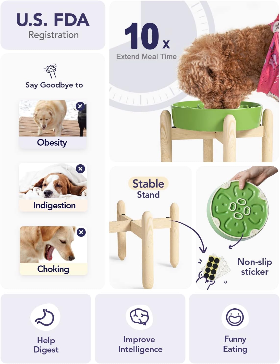 LE TAUCI Ceramic Slow Feeder Dog Bowls Elevated, 3 Cup Raised Bowl with Wooden Stand for Medium Large Breed, Slow Down Eating, Puzzle Dog Food Bowl, Clover Green