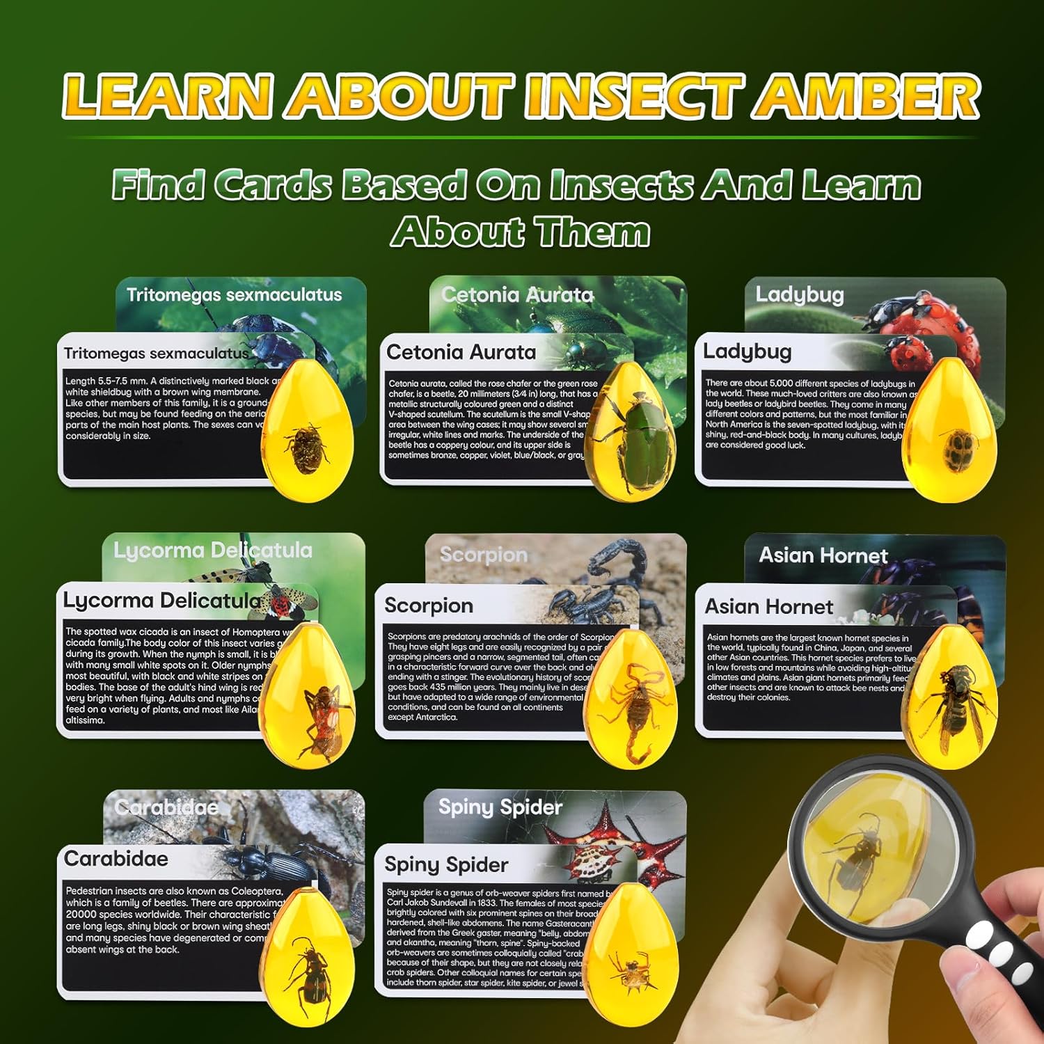 - 【Insect Observe & Learn】The amber dig kit inspires children's love for geology and amber insects. Every time a new amber insect is dug up, kids can find a matching insect study guide to learn about these insects toys, and take a 10x magnifier to observe every detail and texture of the bugs toys.
