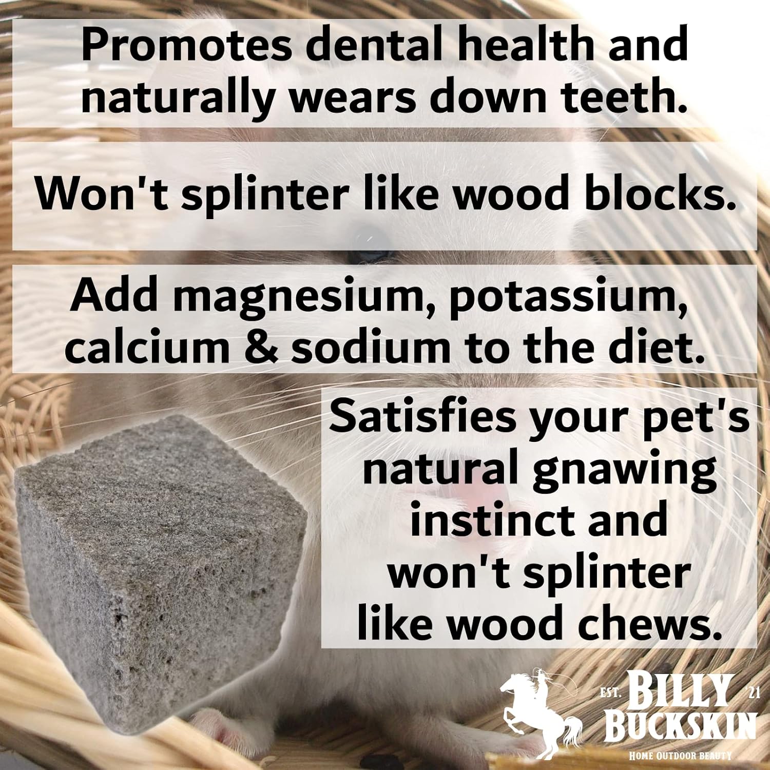 - NATURAL CHEW TREATS WITH NUTRIENTIONAL BENEFITS - Billy Buckskin Pumice Rabbit Treats are more than just engaging chew toysâthey naturally support dental health and offer trace mineral benefits for rabbits, guinea pigs, hamsters, chinchillas, and other small pets. Ideal for daily cage enrichment, these nutrient-rich pumice stones help wear down teeth safely while promoting activity and overall well-being.