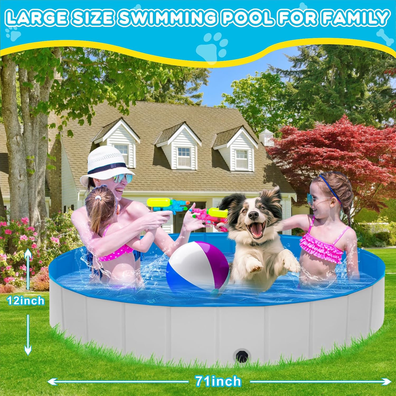 Extra Large Foldable Dog Pool,71"x 12" Portable Anti-Slip Kiddie Pool Hard Plastic, Swimming Pool for Dogs Cats and Kids Pet Puppy Bathing Tub