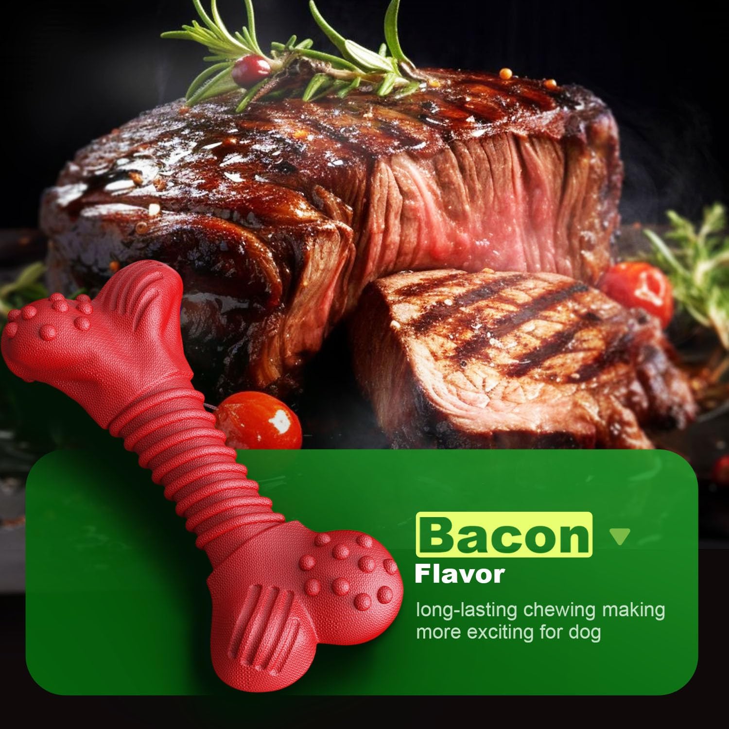 - Bacon Flavor for Maximum Attraction: The bacon flavor is an extra flavor your dog will love, and will appeal to even the pickiest chewers. The chew toy keeps dogs busy while satisfying their natural desire to chew, making it easier to play tug of war with them, exercising their jaws and cleaning their teeth to help them behave better. This makes it ideal as one of the dog toys to keep them busy when they are left alone.