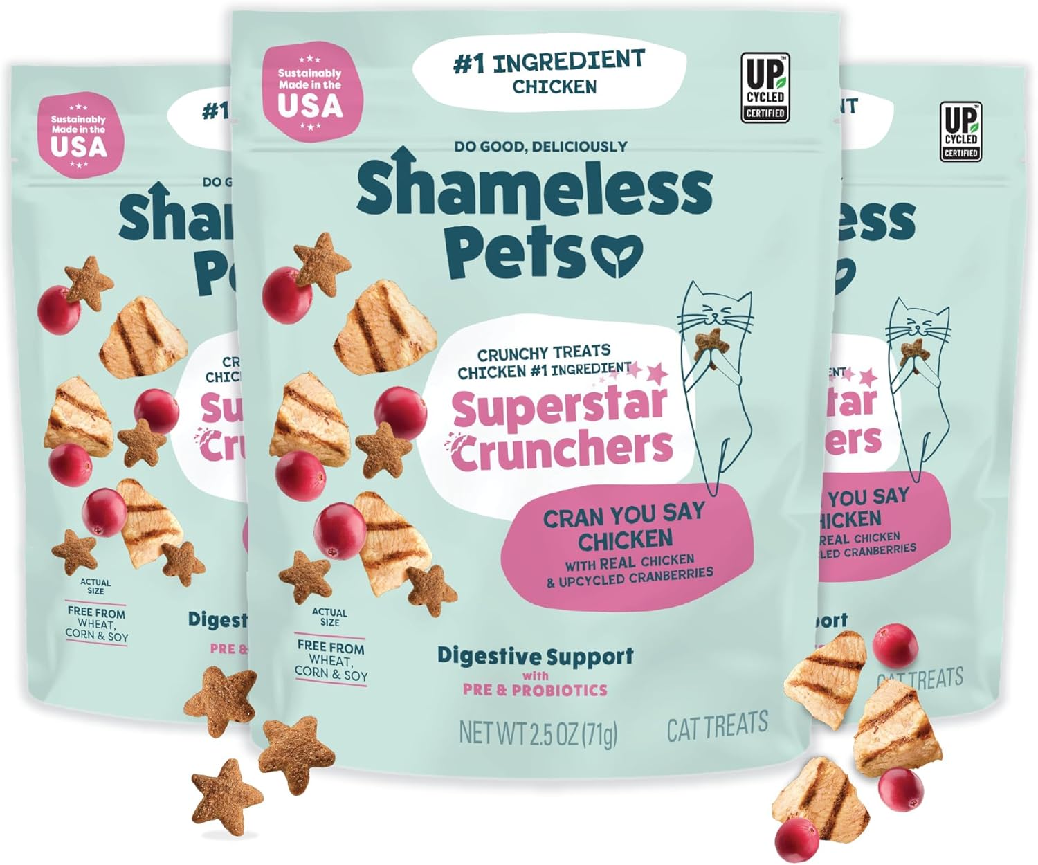 - Cat Treats That Support Digestive Health: Whether you have a celeb or average kitty they will love our blend of savory chicken with a hint of tart cranberries. These crunchy, star-shaped, bite-sized treats are packed with both pre & probiotics, which help support digestion! Includes three 2.5 oz bags.