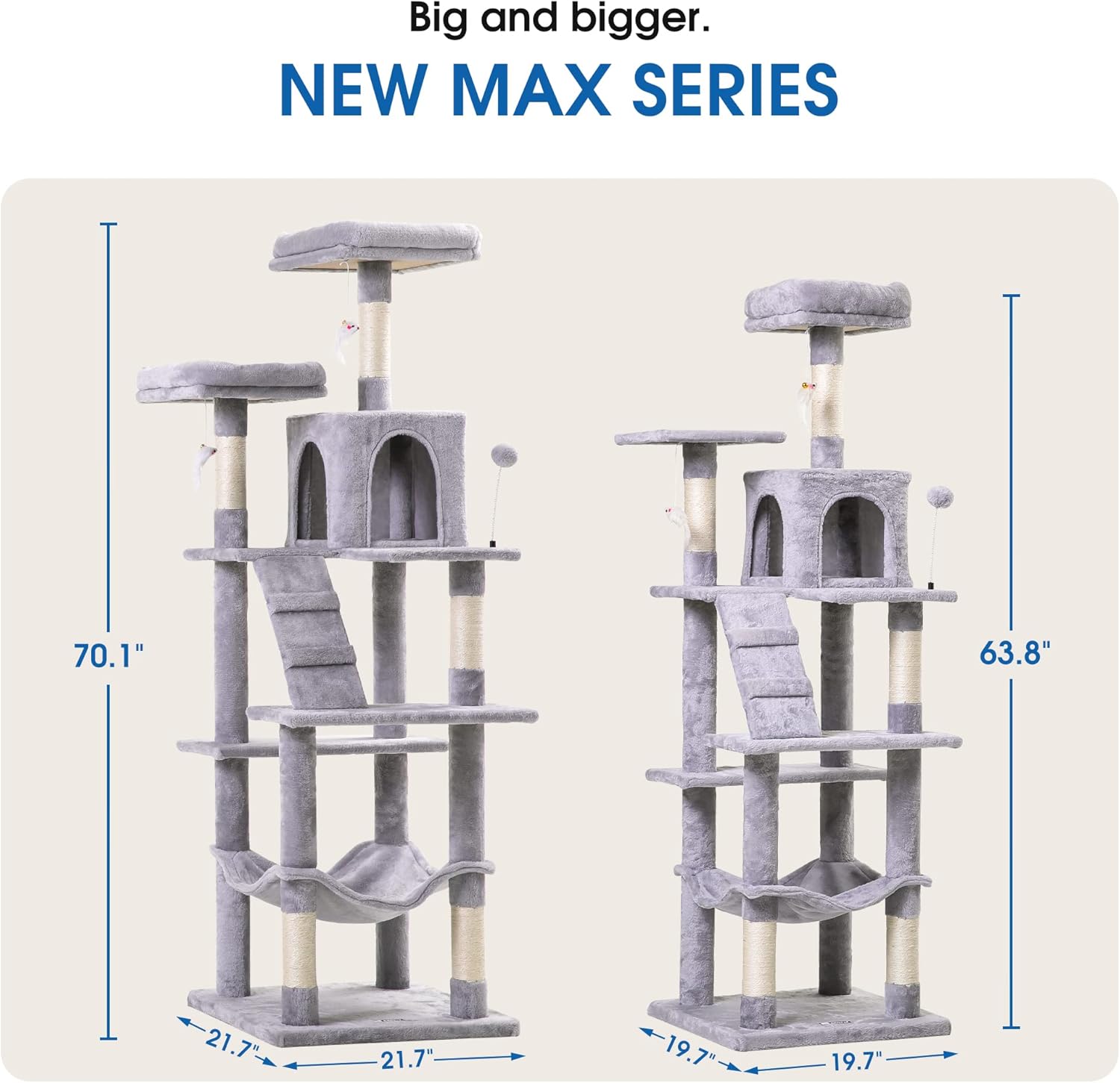 MWPO 70.1-Inch Large Cat Tree, Multi-Level Tall Cat Tower for Indoor Cats, Plush Cat Condo with Big Padded Perches, Sisal-Covered Scratching Posts, Hammock, Toys for Kittens & Cats - Light Grey