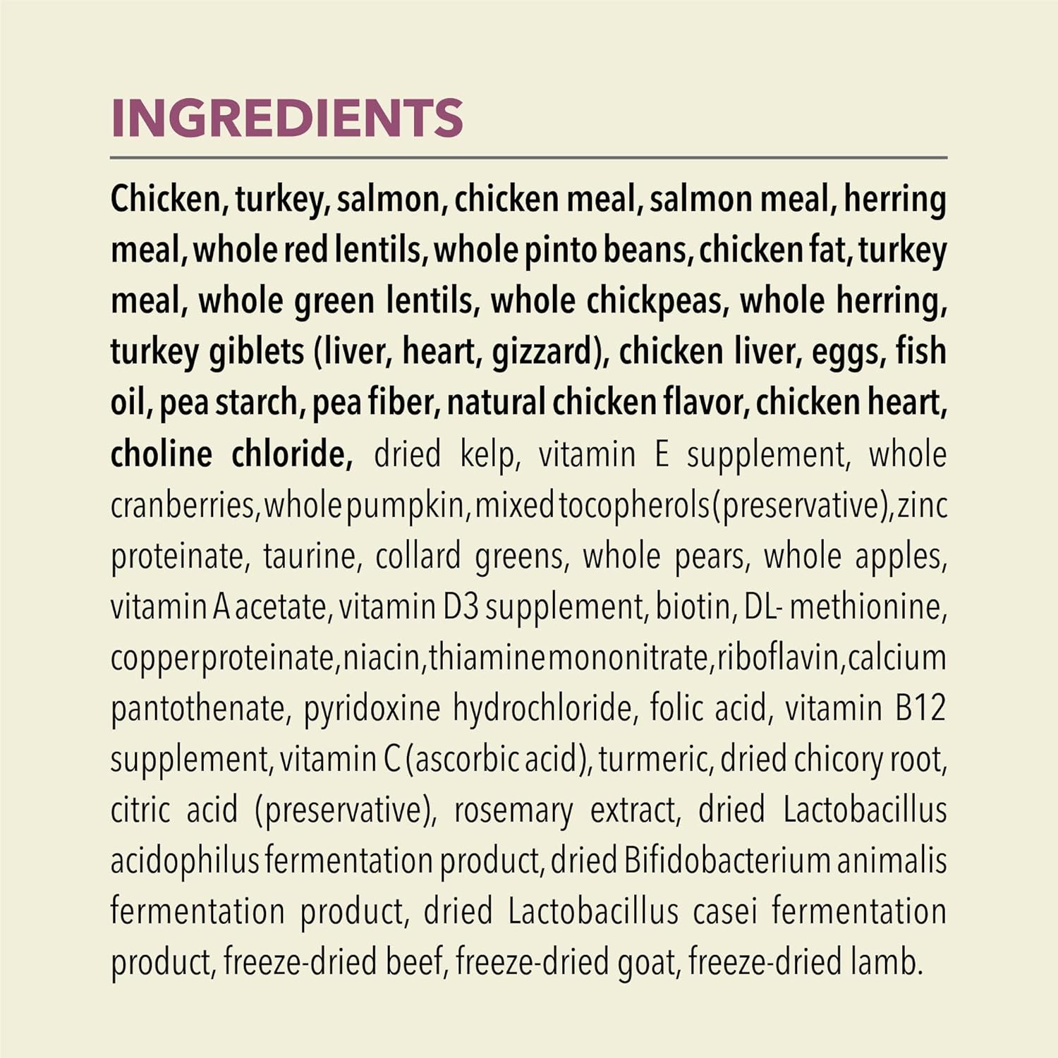 - High protein grain free dry cat food recipe features free run* chicken, free run* turkey and salmon and is balanced to include 75 percent** animal ingredients